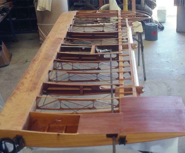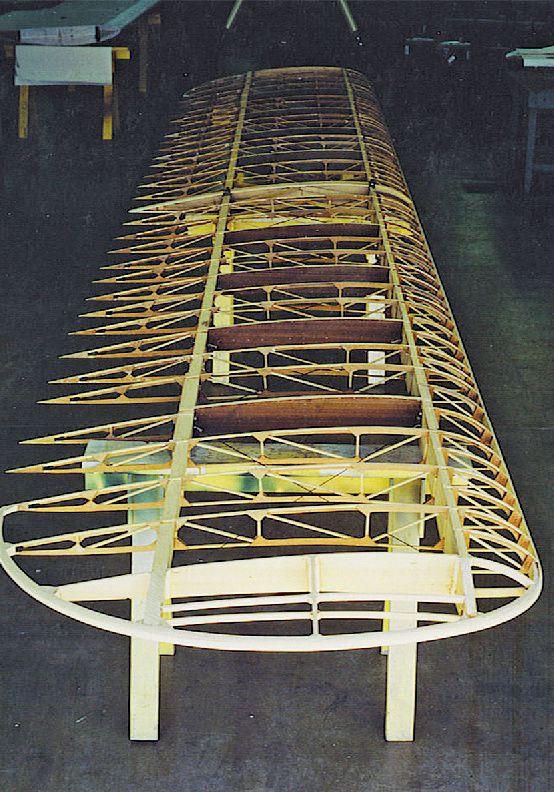 The Command-Aire upper wings taking shape. Note that the wings are bolted together to assure proper fit when aircraft will be rigged for flight. At this point the leading edge plywood skin has not been installed. Installation of the leading edge skin takes skill; the job is made easier if one has done it before. Nailing strips will be used to apply pressure to glue joints while the adhesive cures. Nailing strips are cut from clear pine and will measure 1/8-inch thick and 1/4-inch to 1/2-inch wide depending on how wide the glue joint requires the clamping pressure to be applied.