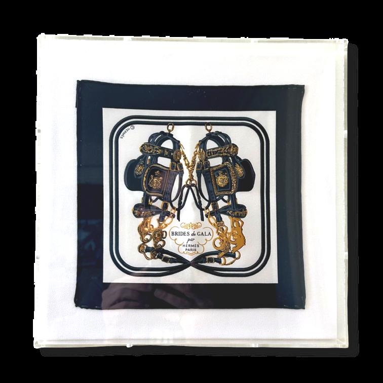 Prices show are MSRP | Trade & Stocking Dealer Discounts Apply All items subject to prior sale wholesale@vintageluxeup com | 310-528-5355 Vintage Hermès Brides de Gala Red 100% Silk One-Of-A-Kind Hugo Grykgar c. 1957 H2234 Framed Scarf Acrylic Shadow Box 10" $898 SOLD OUT