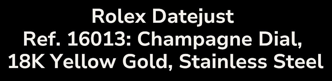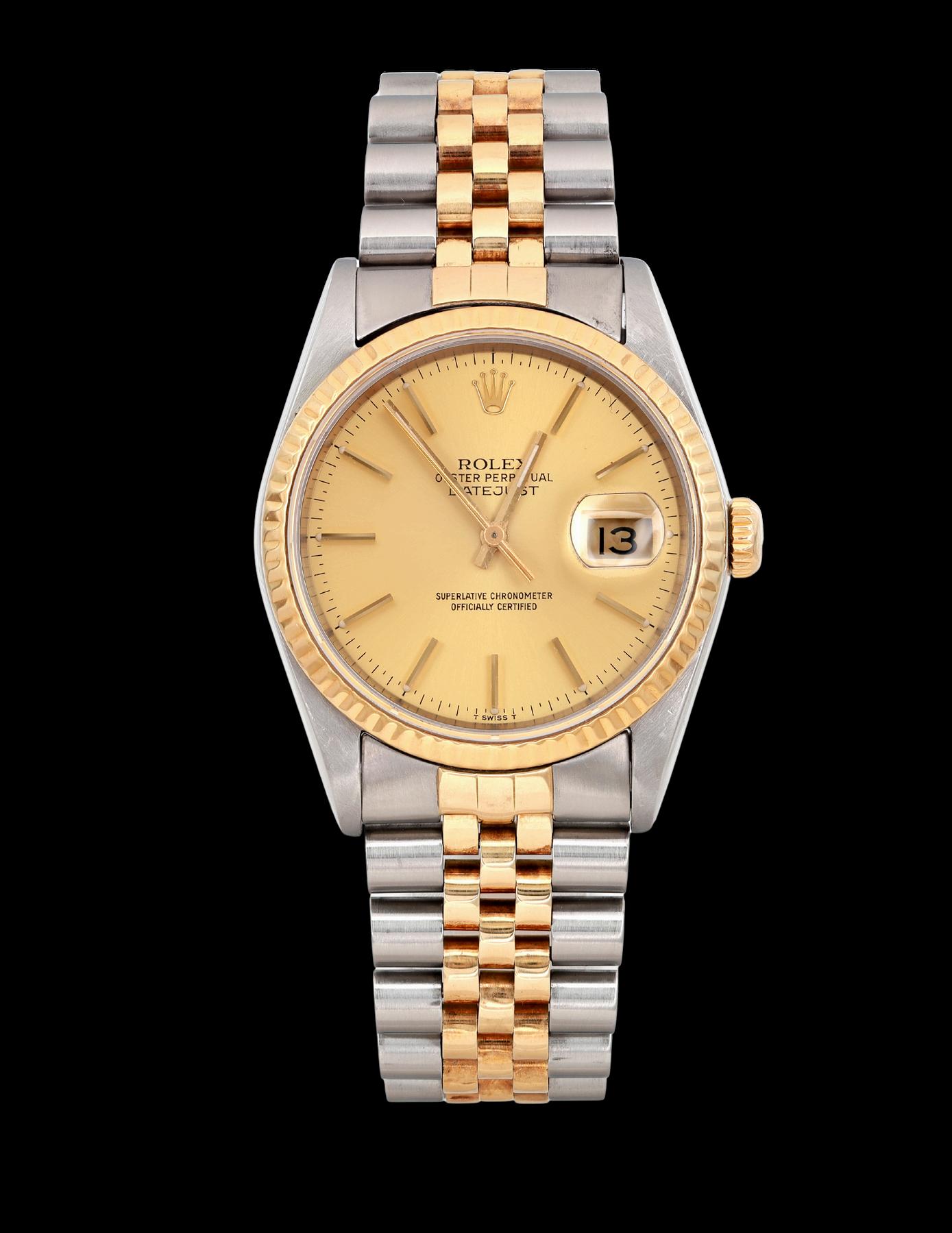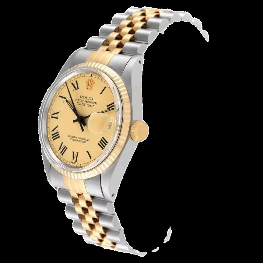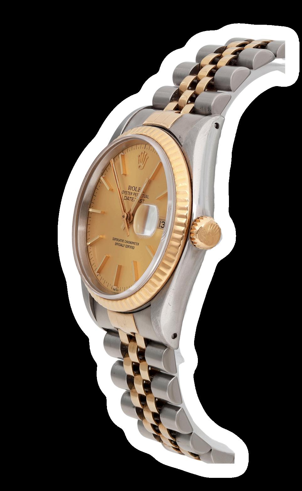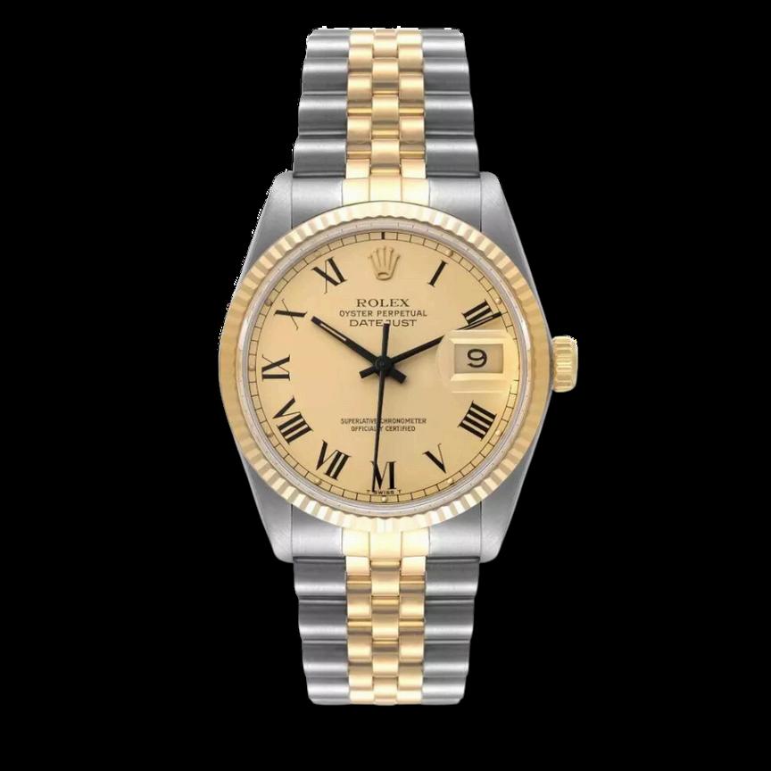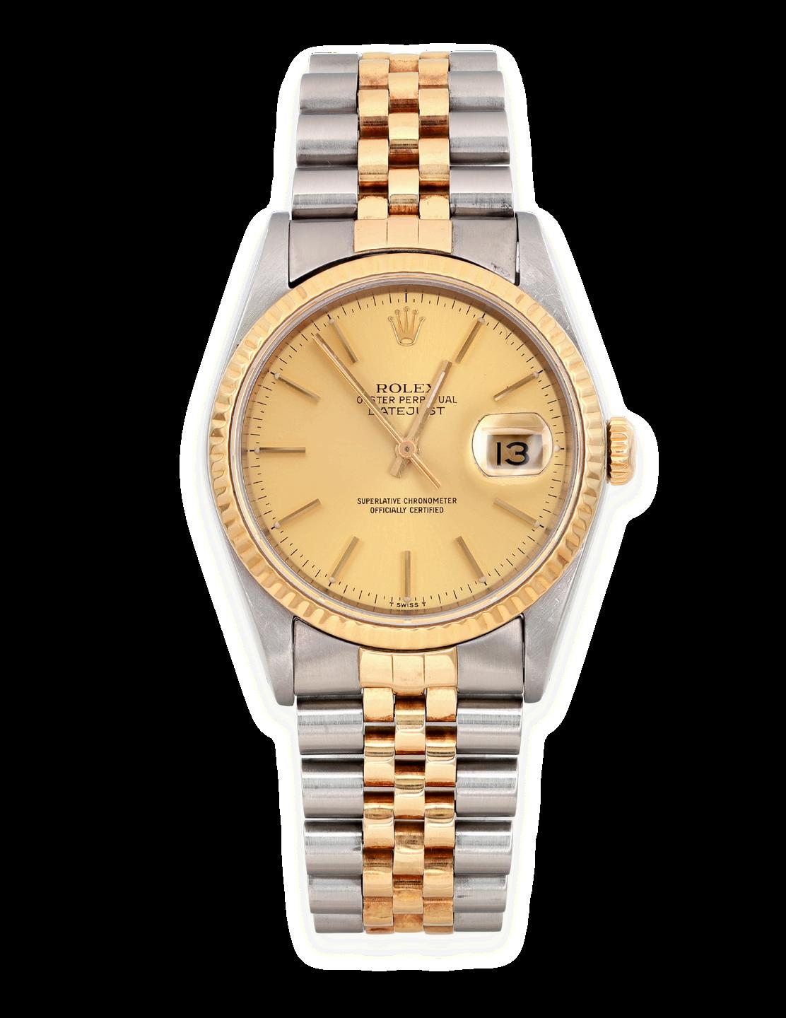 The Rolex Datejust Reference 1601 with a twotone configuration, featuring a smooth Champagne dial and Jubilee bracelet, is a superb representation of Rolex's dedication to elegance and precision. The two-tone design, with its combination of stainless steel and yellow gold, exudes sophistication, while the smooth Champagne dial enhances its timeless appeal. The Jubilee bracelet, renowned for its comfort and style, complements the overall luxurious aesthetic of this iconic timepiece.