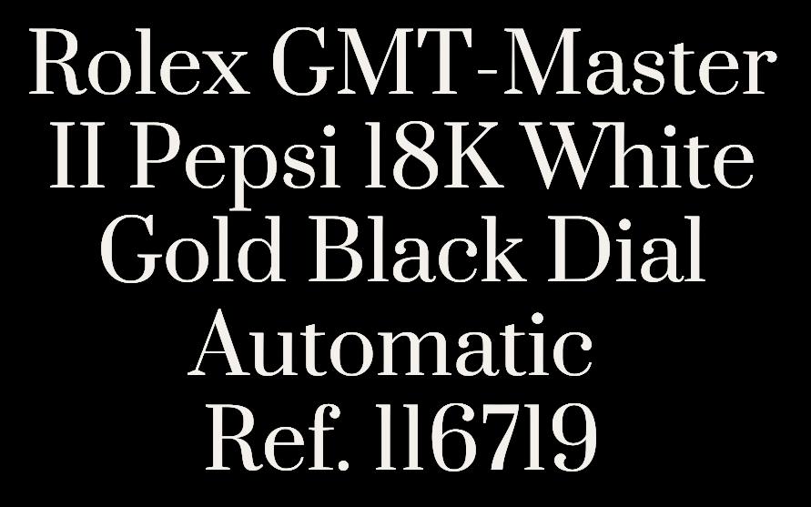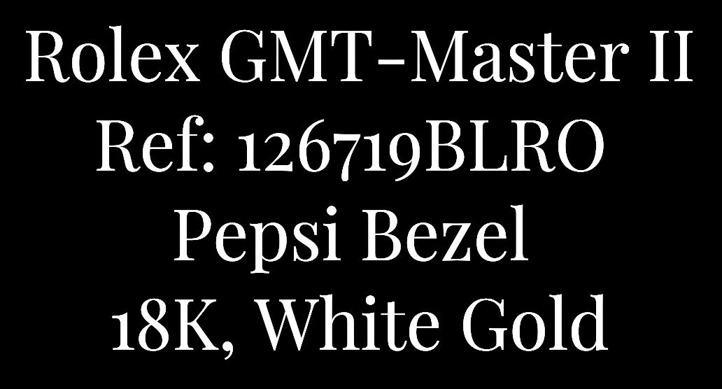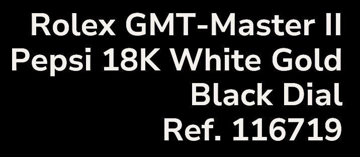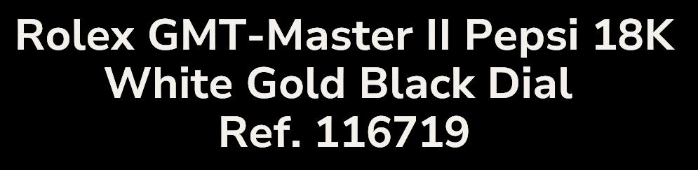 This Rolex GMT-Master II Reference 126719BLRO exemplifies luxury and precision, featuring the iconic Pepsi bezel coloration in blue and red, a signature of Rolex's celebrated GMT-Master series. The sophisticated black dial is perfectly complemented by the polished 18K white gold case and bracelet, which radiate exclusivity and highstatus allure. The choice of white gold not only adds to the aesthetic appeal but also enhances the timepiece's durability and prestige, making it a standout piece in any collection. Complete with its original box and papers, this 2024 model is an impeccable investment for discerning collectors.