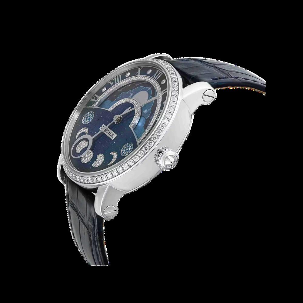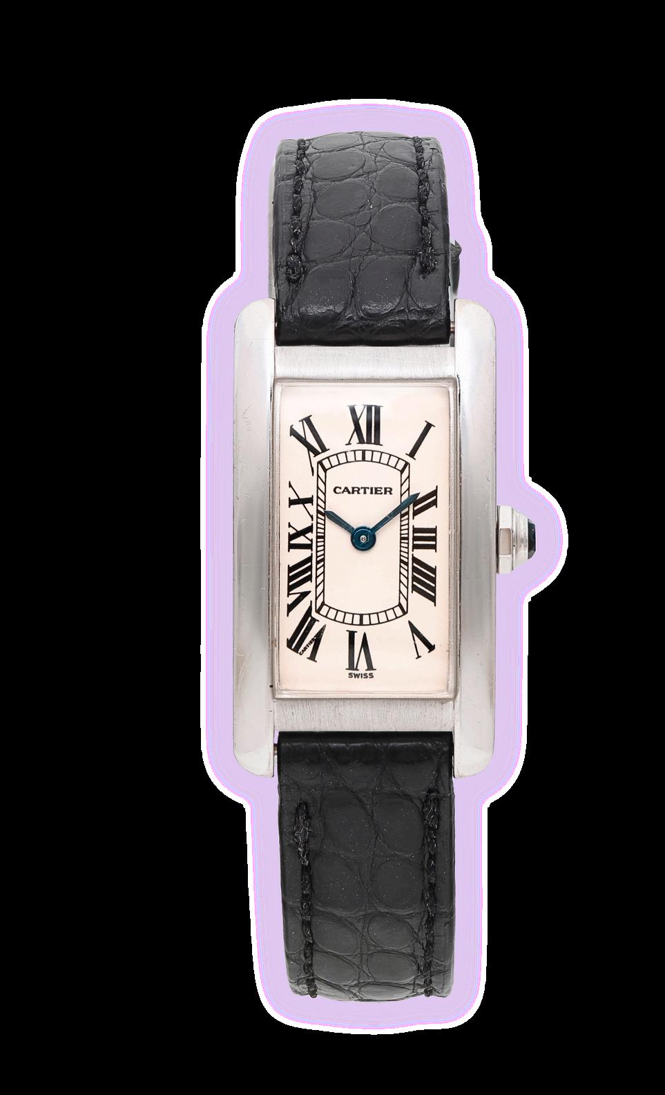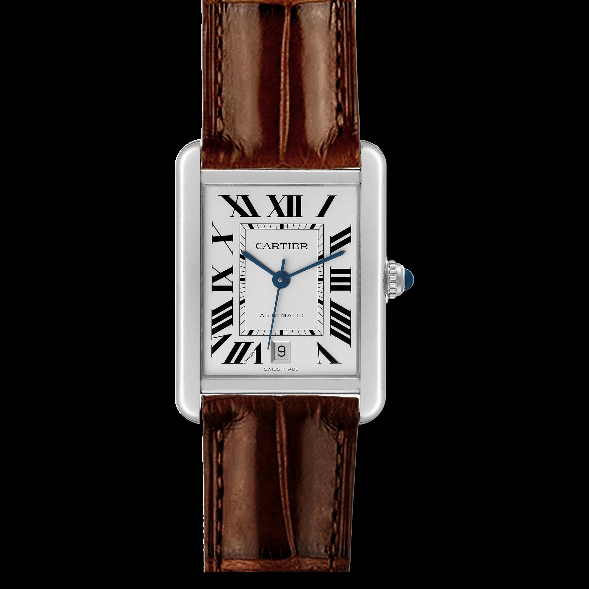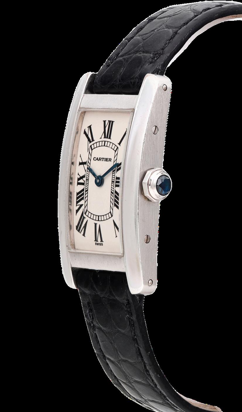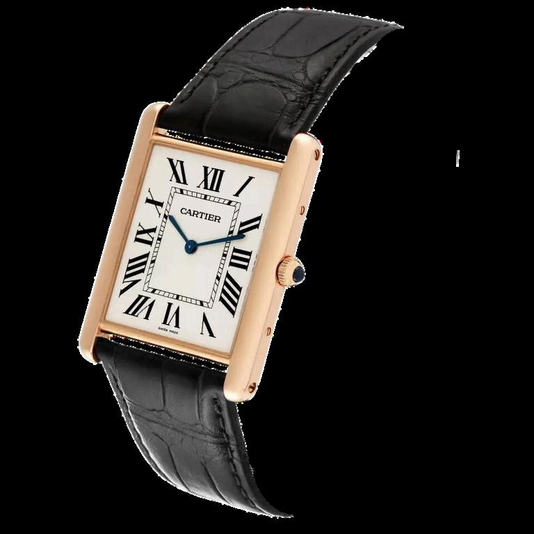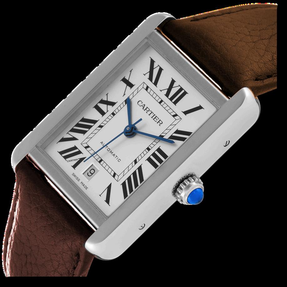 Classic Roman numerals on the dial Blued steel hands, a signature of Cartier’s elegant design