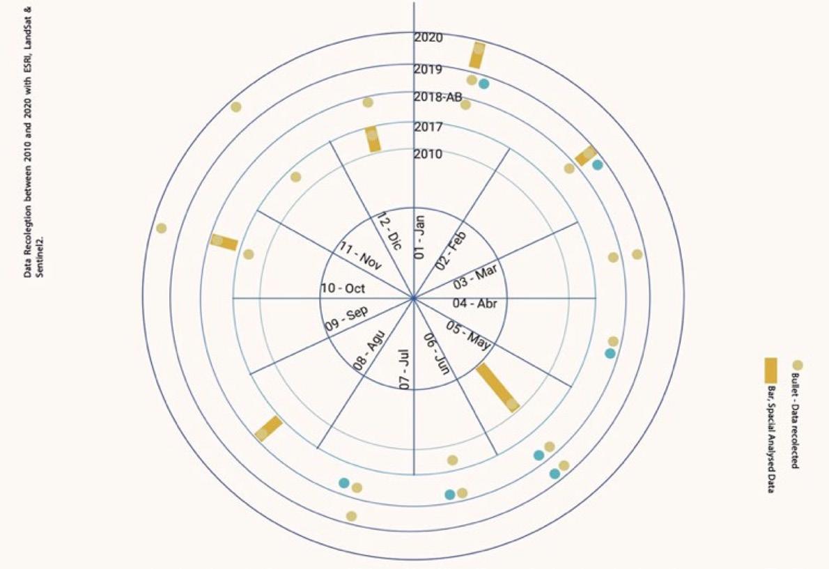 The figure above helps to understand the three types of data classification the project used. The first type of data marked with yellow dots are 20 satellite files collected23 between 2010 and 2020, for potential use of NDVI24 analysis (technical topics will be further developed in chapter 5). After that, a reclassification of the 20 files mentioned above had to be carried out, leaving six main files which are represented by yellow stripes. This data went through different processes to conclude the NDVI-based classification, a tool that distinguishes vegetation from water and soil, thereby making the changes visible that this territory has suffered over a decade, as the Figure 4 shows below. Parallel to this, the classification marked with blue dots shows the key events narrated under a social concern on the emergencies between 2018 and 2019