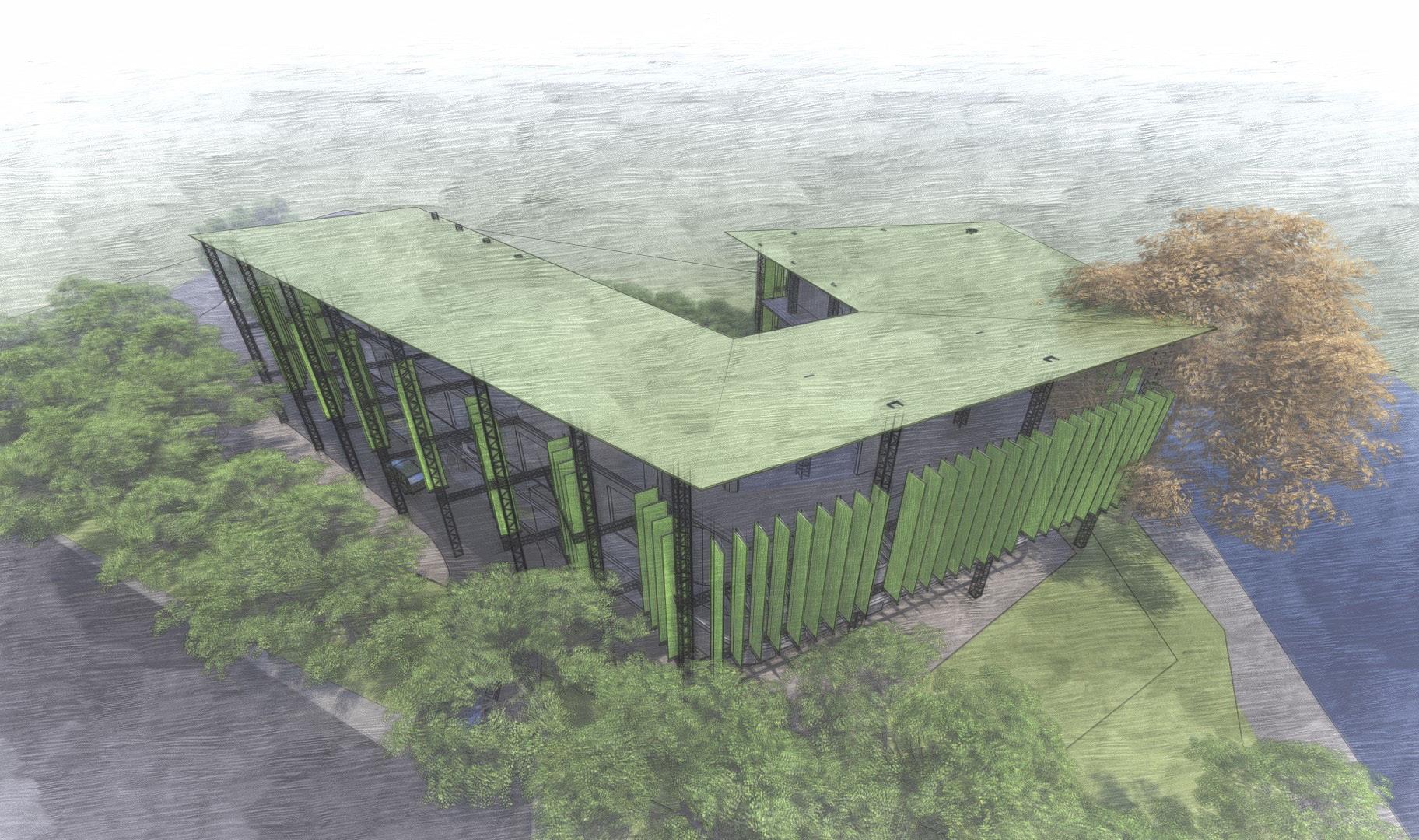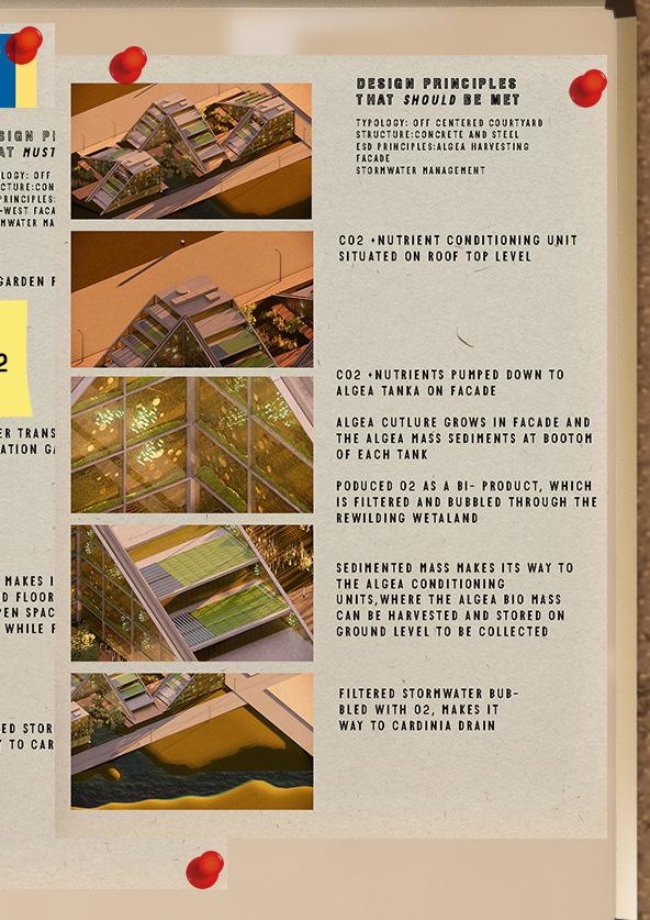 The typology, structure and environmental system implemented is first explored and designed by studying existing systems to be brought together. In 2022 the building has a system of stepped storm water filters through a passive system of roof gardens and which plays a major role in the biodiversity concept of re-wilding the native wetland ecosystem. In 2050 the gutter and roof gardens are replaced with an algae facade system that provides shade, generates oxygen and provides a purpose for an otherwise obsolete office building at night.