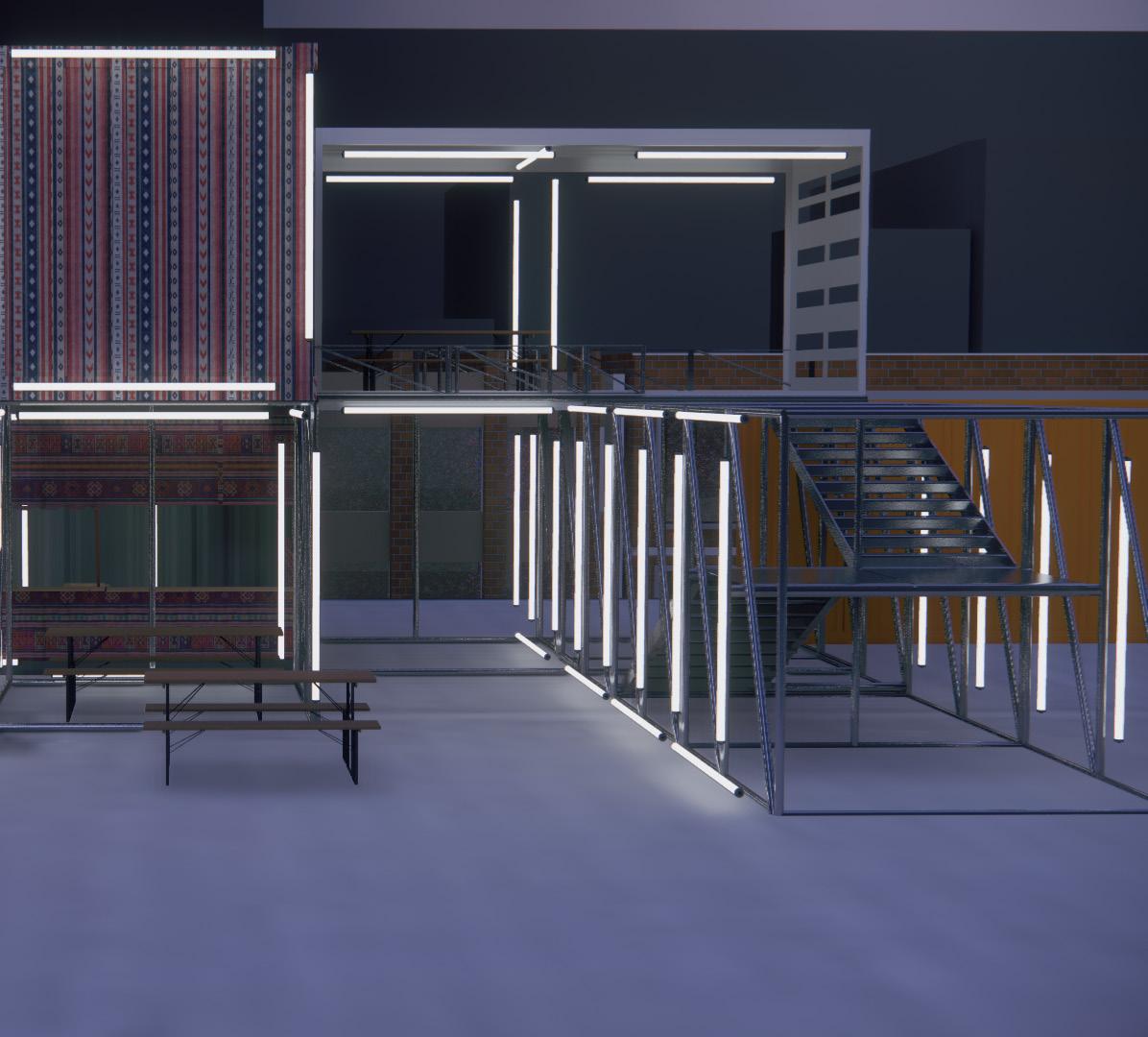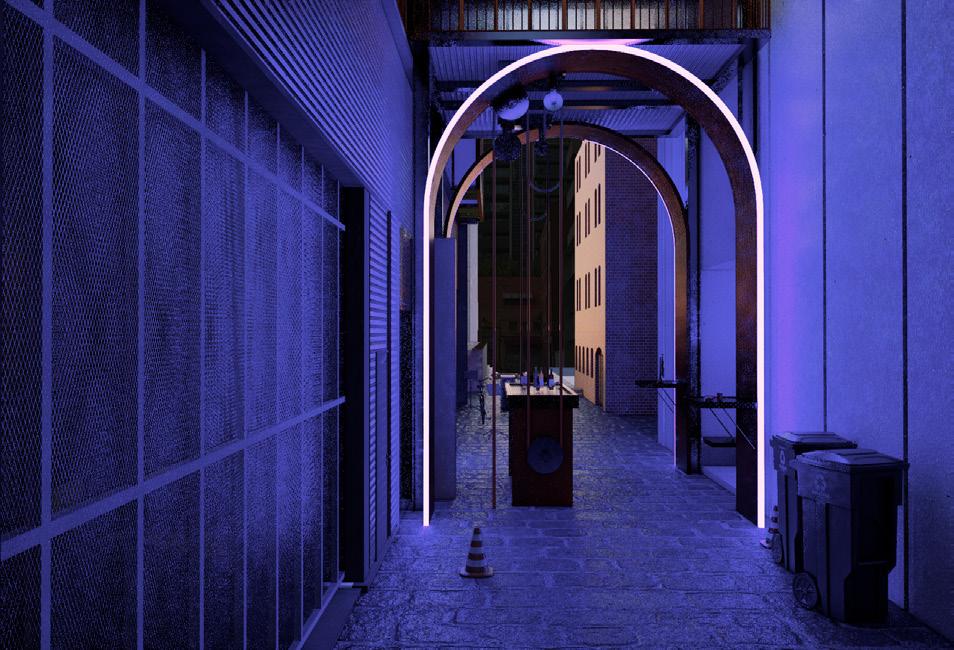 The loading dock functions by day for the hotel supplies to be unloaded at, but at night as it becomes a dark obsolete space, but it has been now been given a new life. A drop-down bridge hidden away by day, drops down creating an elevated gantry leading the guests of the ambalama to the Bird's Gantry- giving them free access to enjoy the jazz at the Bird's basement , without interrupting the usual members of the jazz club