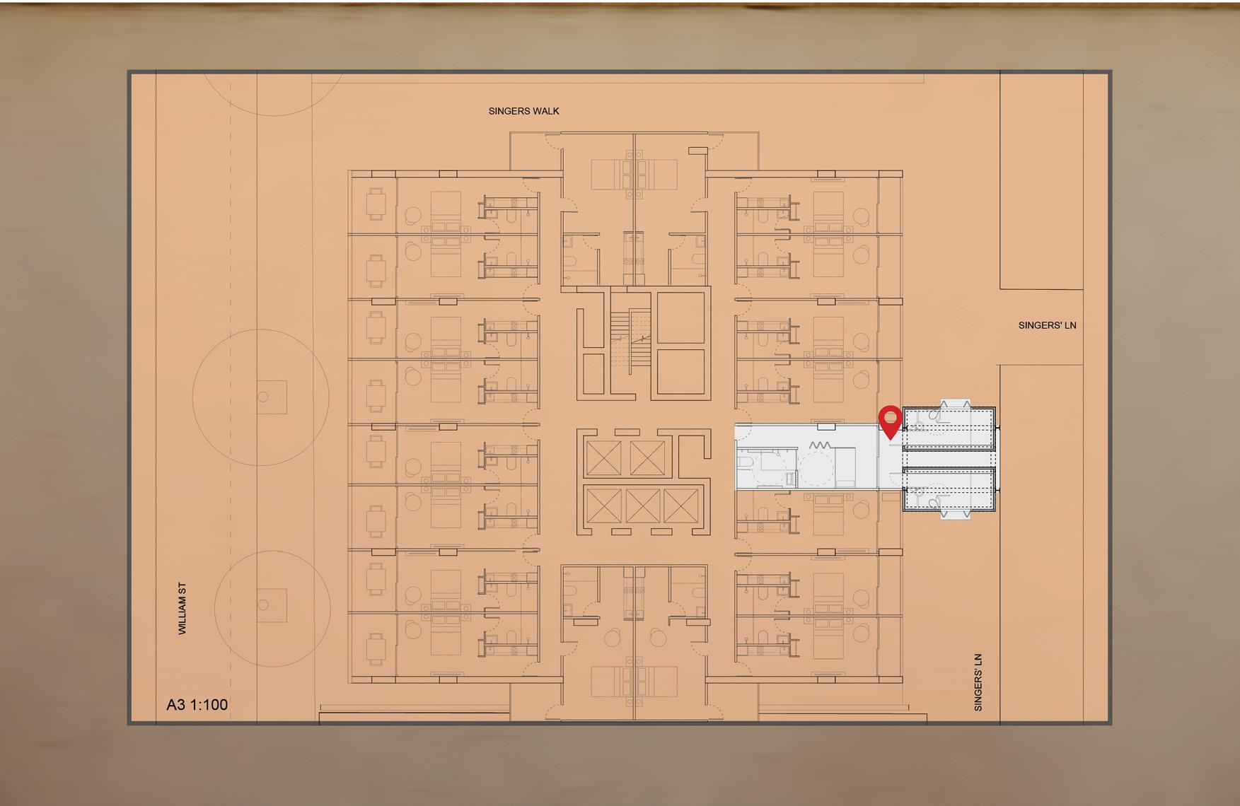 Plan of the existing building and rooming pods in the tower on Singer's Lane.
