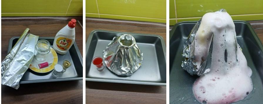 Skleničku postavíme na talířek. Odstřihneme si kus alobalu tak, aby po překrytí skleničky jeho konce přesahovaly přes okraj talířku a daly se zasunout pod talířek. Vytvarujeme tvar sopky. Navrchu zakryté skleničky uděláme opatrně do alobalu otvor. Do tak připravené sopky nasypeme asi tři čajové lžičky jedlé sody.