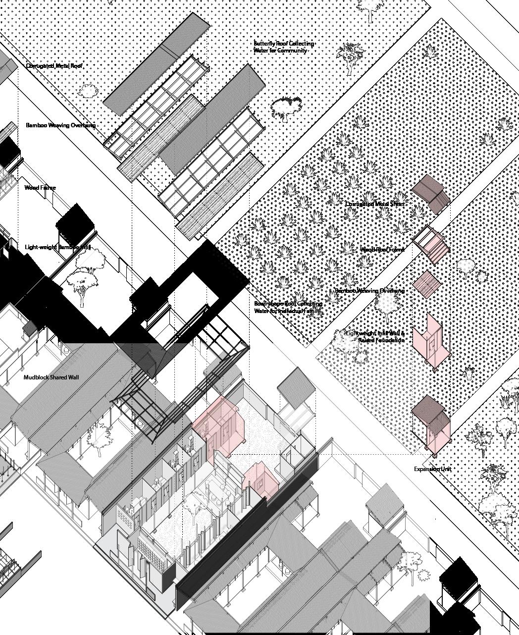 Sustainability and project longevity are two main goals of this project. The modular design approach with approachable materials gives residents flexibility for future expansion. The slope and sharing roof systems collect rainwater for both individual families and communities.