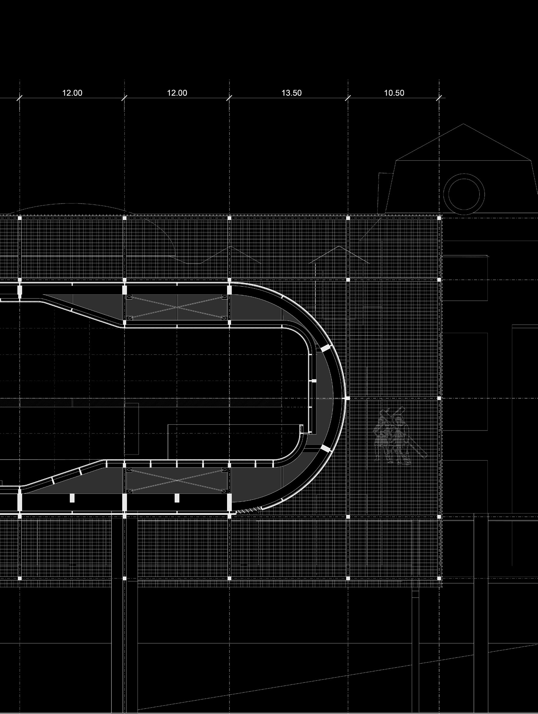 The landscape is subdivided by "bars" on the field, shaping spaces with the edges of the existing building complex. The buildings on the field also serve as filters and boundaries to separate outside visitors from the nuns' living space. The public and the private areas intersect at the raised church. While visitors ascend to the church by a ramp, the nuns access the building on the ground level at the side of the dormitory.