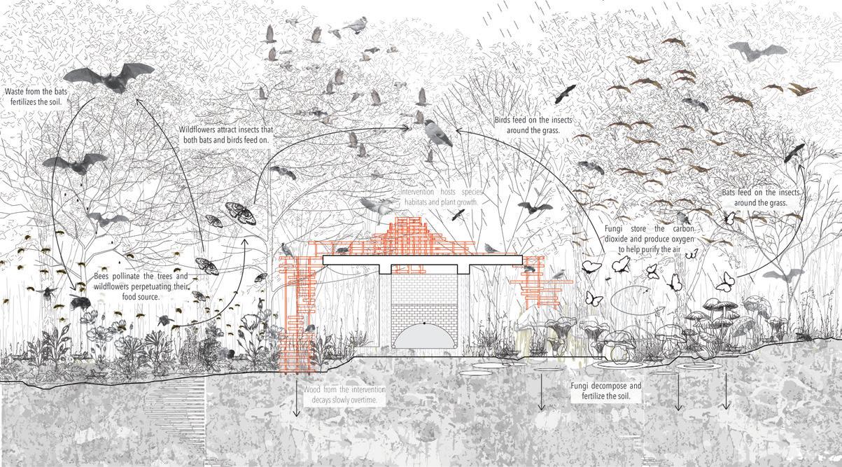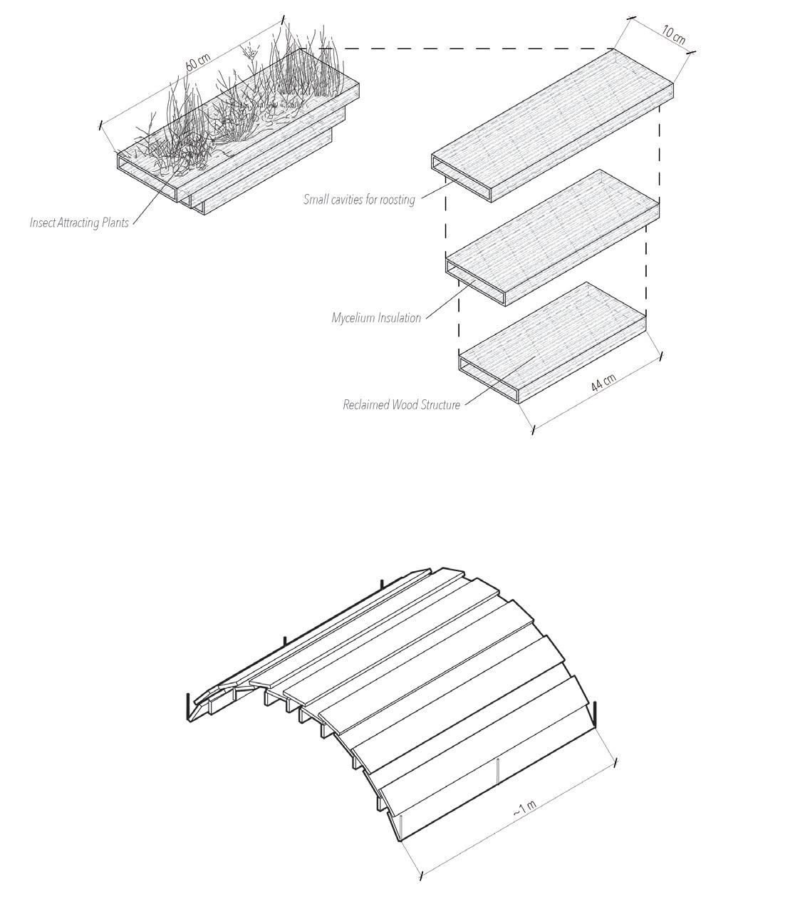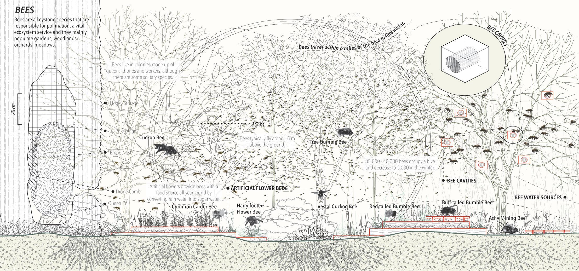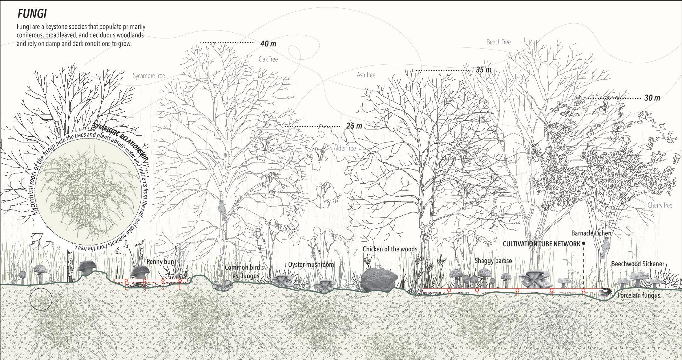 Bioblend is a posthuman architecture design project represents the potential to expand its focus and become more connected to nature and non-human species, including research and data collection on local ecologies and biodiversity in the greater London area and specifically to our site, Old Highgate Overground station, as a priority Habitat area and a critical biodiversity hotspot in London’s city landscape. Our design interventions manifested into a simple form which try to reduce impact to the existing site as much as possible that can evolve over time and become a critical link and “home” for a broader biodiversity network. It also explore the potential for posthuman architecture to evolve into an ecosystem service.Bioblend seeks to redefine the clientele of architectural design and use specific species as design drivers to provide infrastructure for the ever-changing needs of nature. As a part of our analysis, we visualized the biodiversity network as a topography of high and low levels to show the web-like nature of biodiverse avenues. After discovering that Highgate station is located within a priority habitat zone, meaning that it is a critical area for conserving biodiversity, we imagined how this could be showcased, cultivated, and ultimately maintained. We chose three keystone species that help to build resilience which are fungi, bee, bat, and bird.