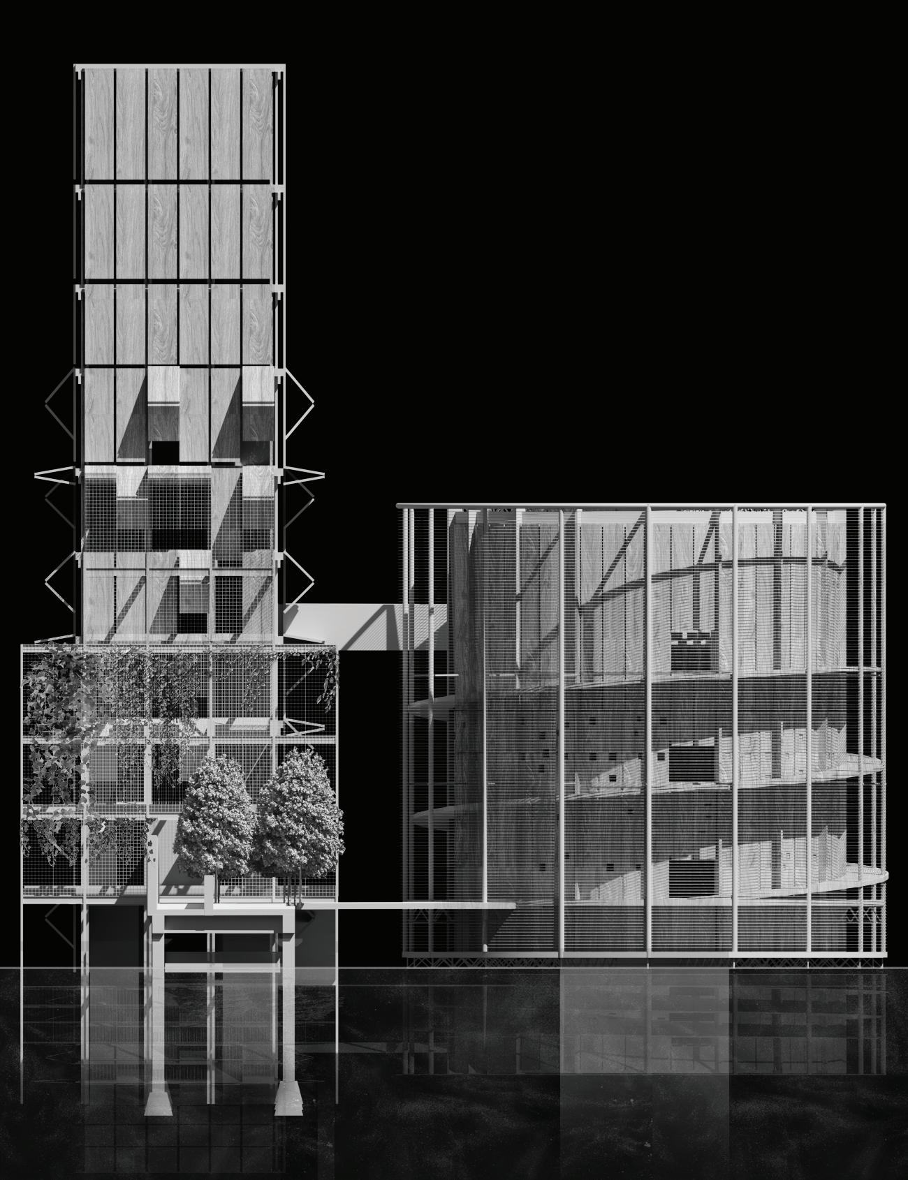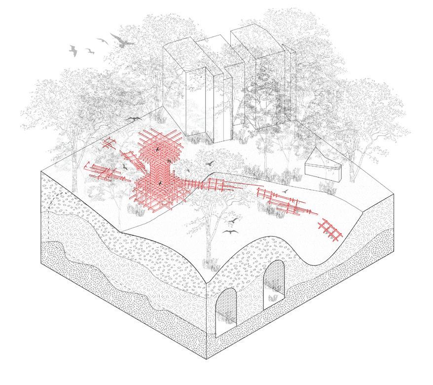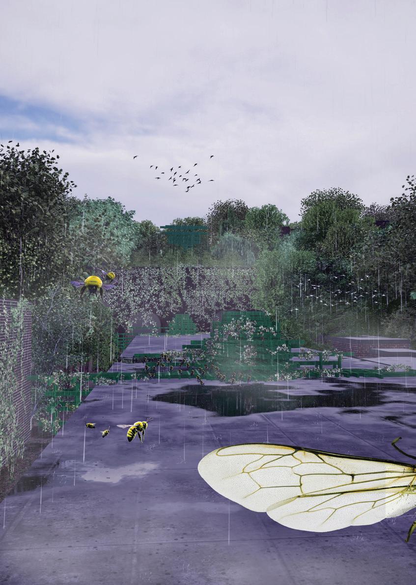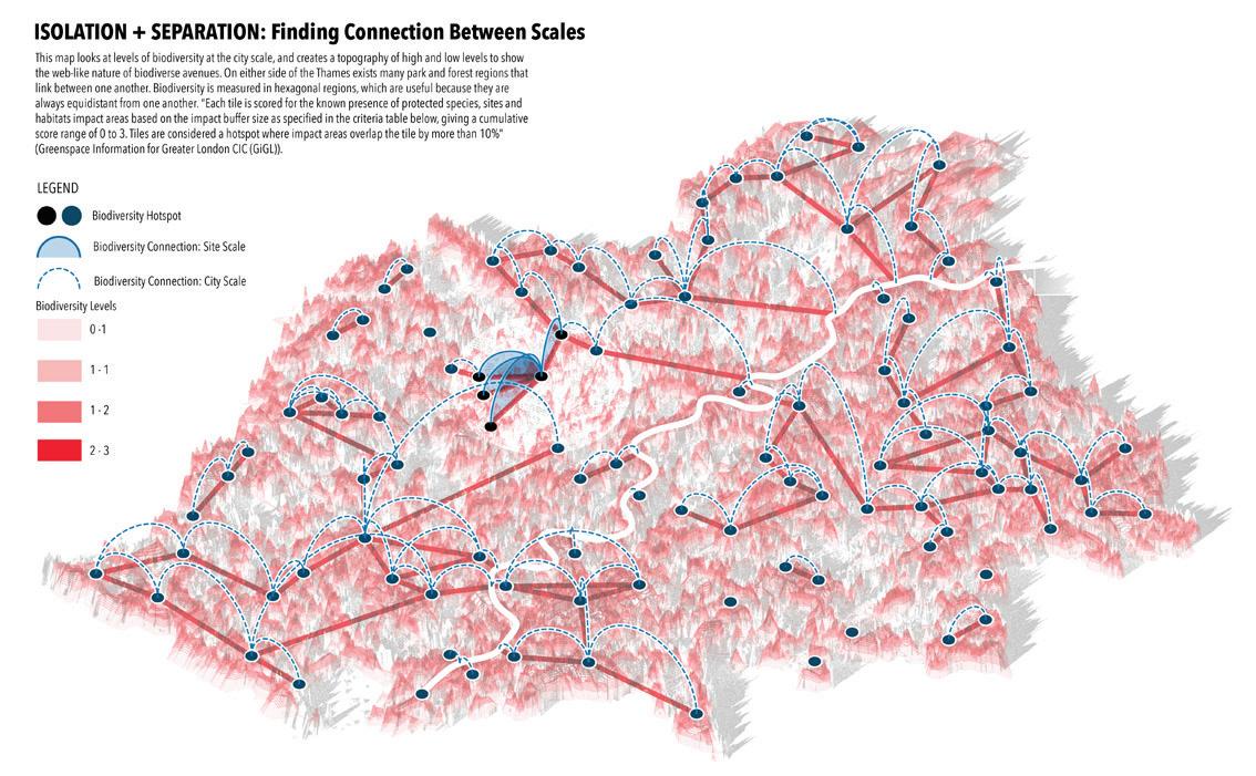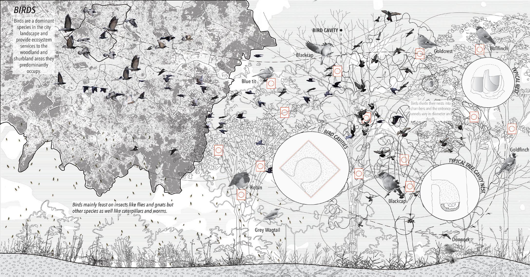 Bioblend is a posthuman architecture design project represents the potential to expand its focus and become more connected to nature and non-human species, including research and data collection on local ecologies and biodiversity in the greater London area and specifically to our site, Old Highgate Overground station, as a priority Habitat area and a critical biodiversity hotspot in London’s city landscape. Our design interventions manifested into a simple form which try to reduce impact to the existing site as much as possible that can evolve over time and become a critical link and “home” for a broader biodiversity network. It also explore the potential for posthuman architecture to evolve into an ecosystem service.Bioblend seeks to redefine the clientele of architectural design and use specific species as design drivers to provide infrastructure for the ever-changing needs of nature. As a part of our analysis, we visualized the biodiversity network as a topography of high and low levels to show the web-like nature of biodiverse avenues. After discovering that Highgate station is located within a priority habitat zone, meaning that it is a critical area for conserving biodiversity, we imagined how this could be showcased, cultivated, and ultimately maintained. We chose three keystone species that help to build resilience which are fungi, bee, bat, and bird.