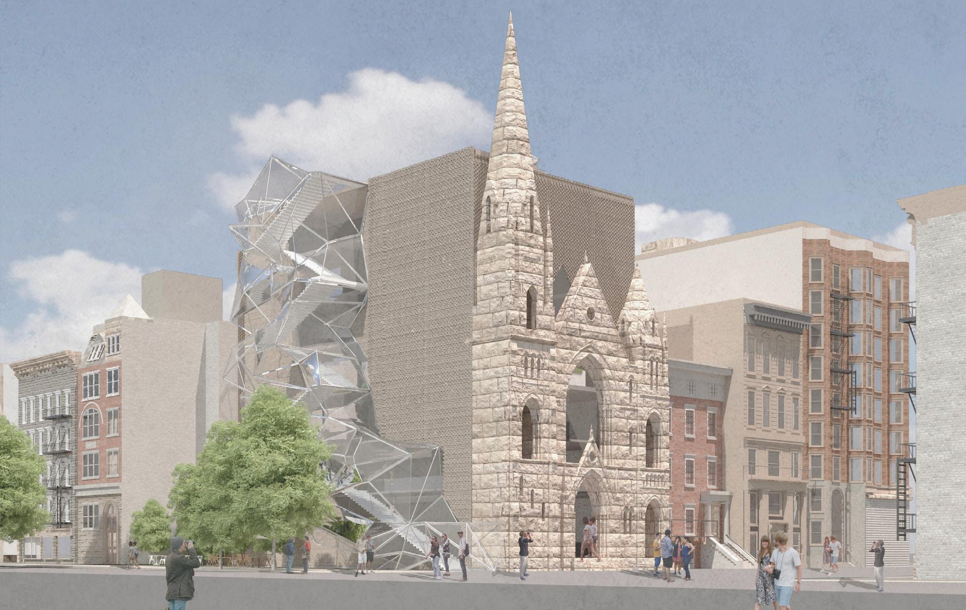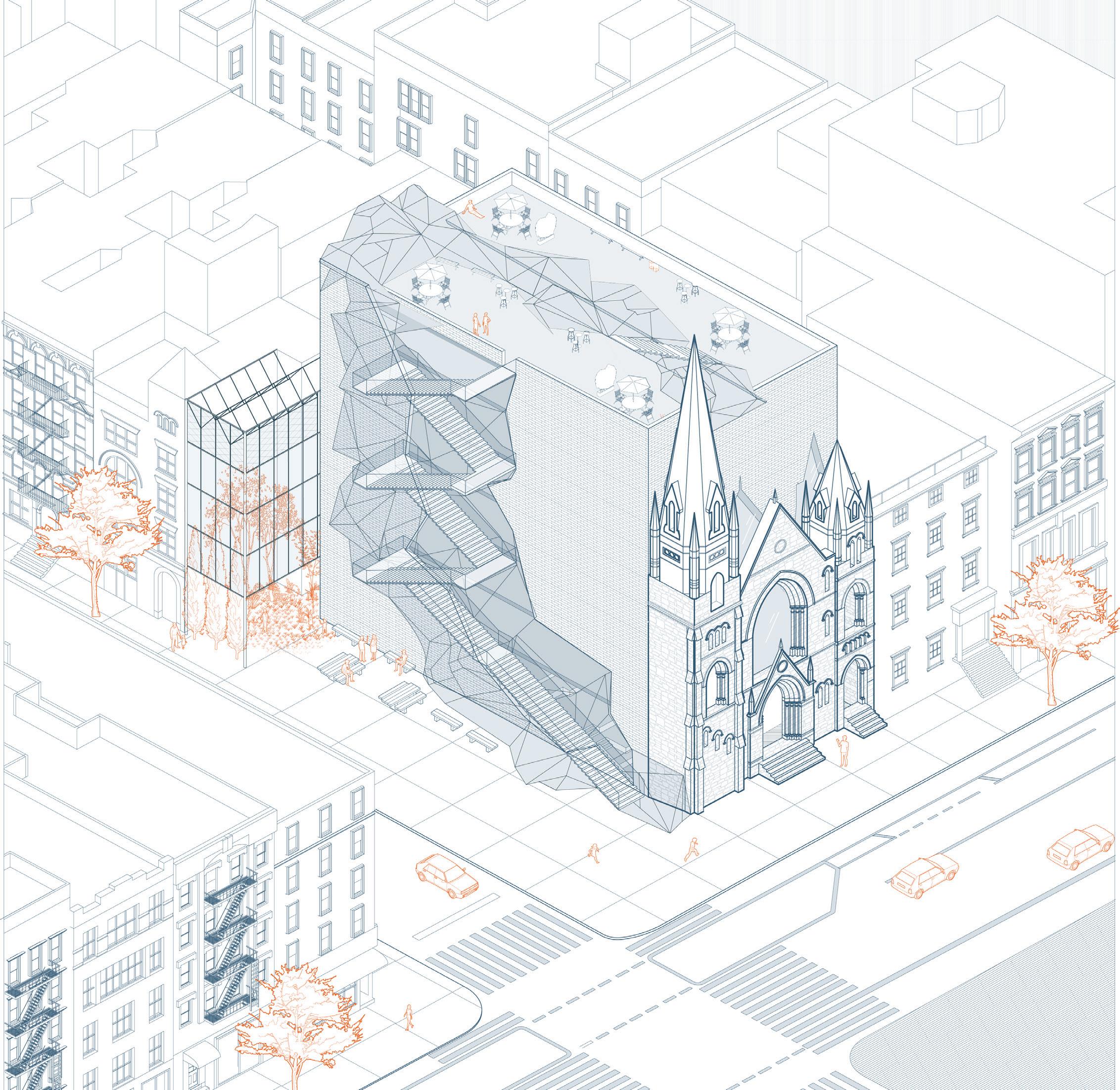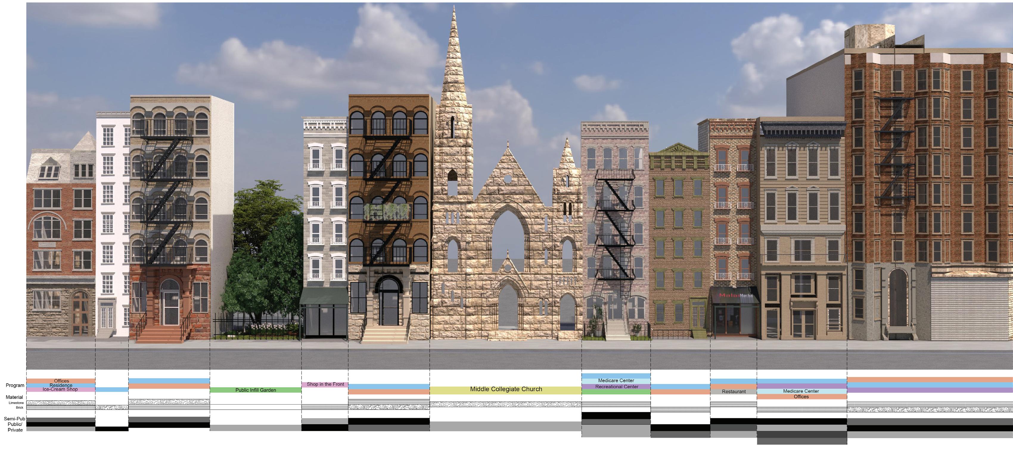 The preservation of these historic district seems to have put an end to most new development projects, and some renovation projects to upgrade old buildings into high-end residences have pushed up housing prices. Some small pop stores can no longer afford the store rent and are about to go out of business one after another; There are no small local bars or restaurant here in east village anymore. “Nowadays, they have tourist nightclubs and tourist celebrity chef restaurants, partygoers, and they lose the local food, bars and other retail stores that were once dedicated to serve the local community. And I noticed that the only free public roof garden in nyc is opened at NYPL’s new midtown branch. That’s the reason why we want to create more public gardens no matter on the ground or within the building. We want to give back the spaces to the community on the meantime to reach the program we want and the preservation of the church facade.