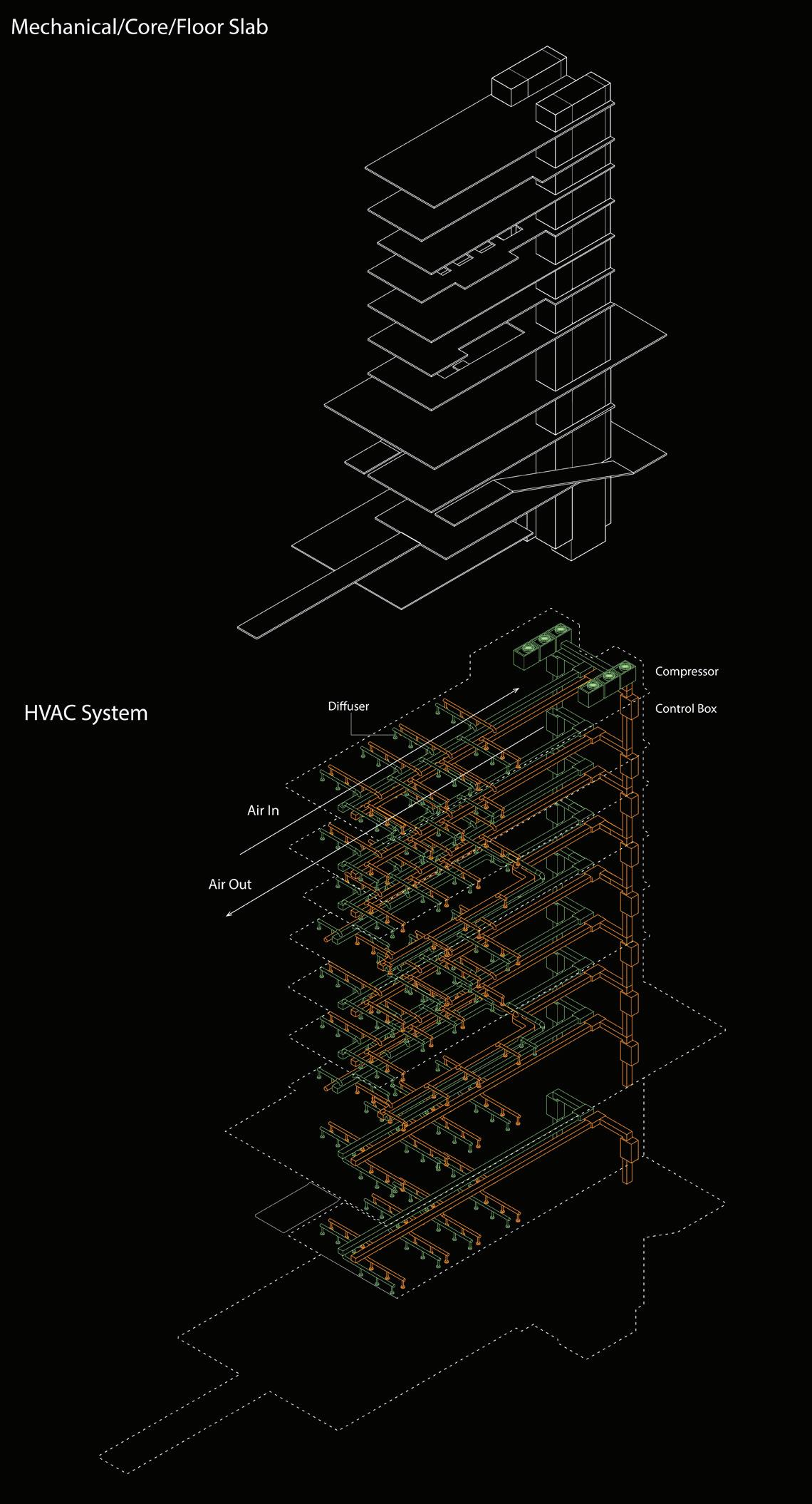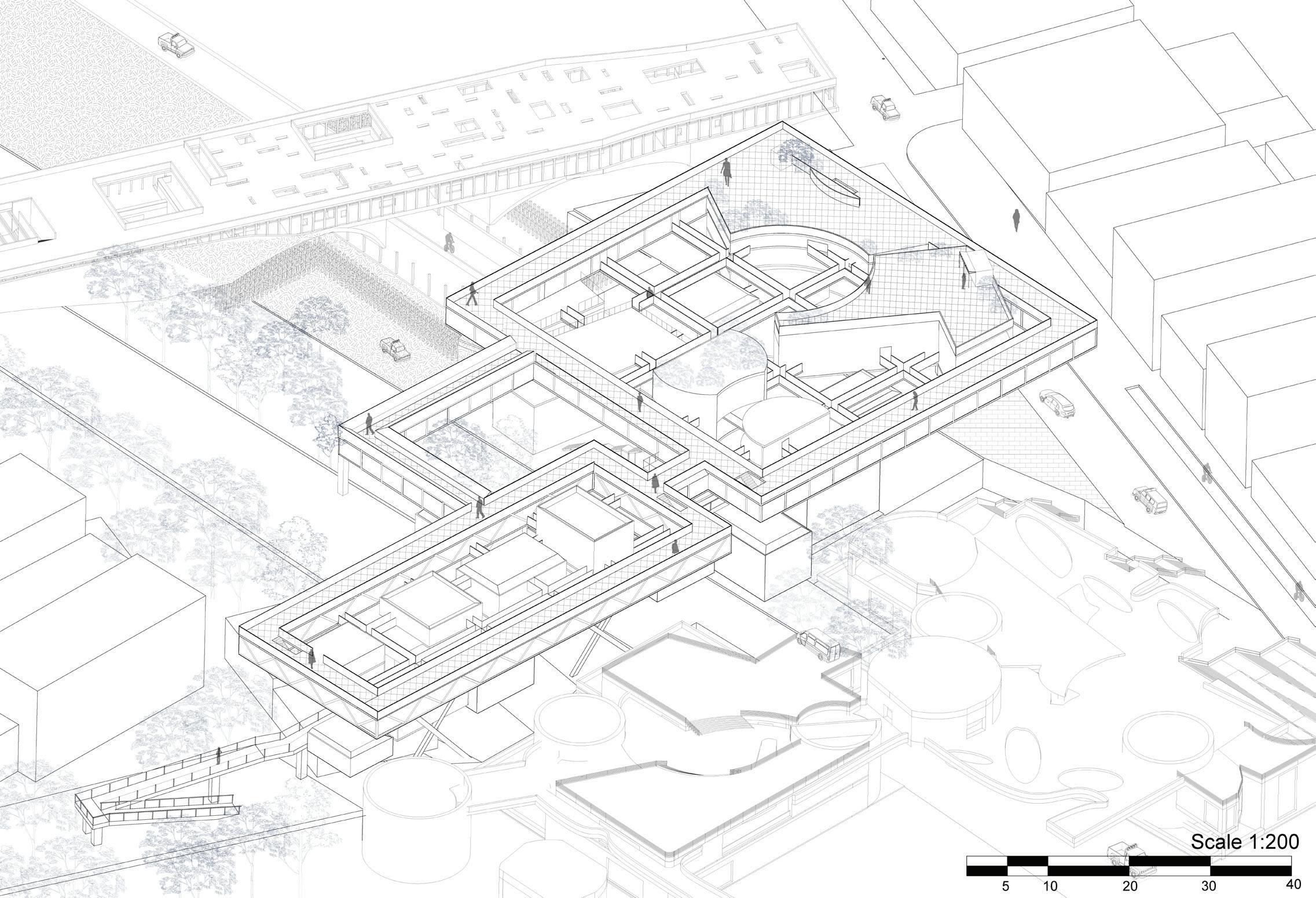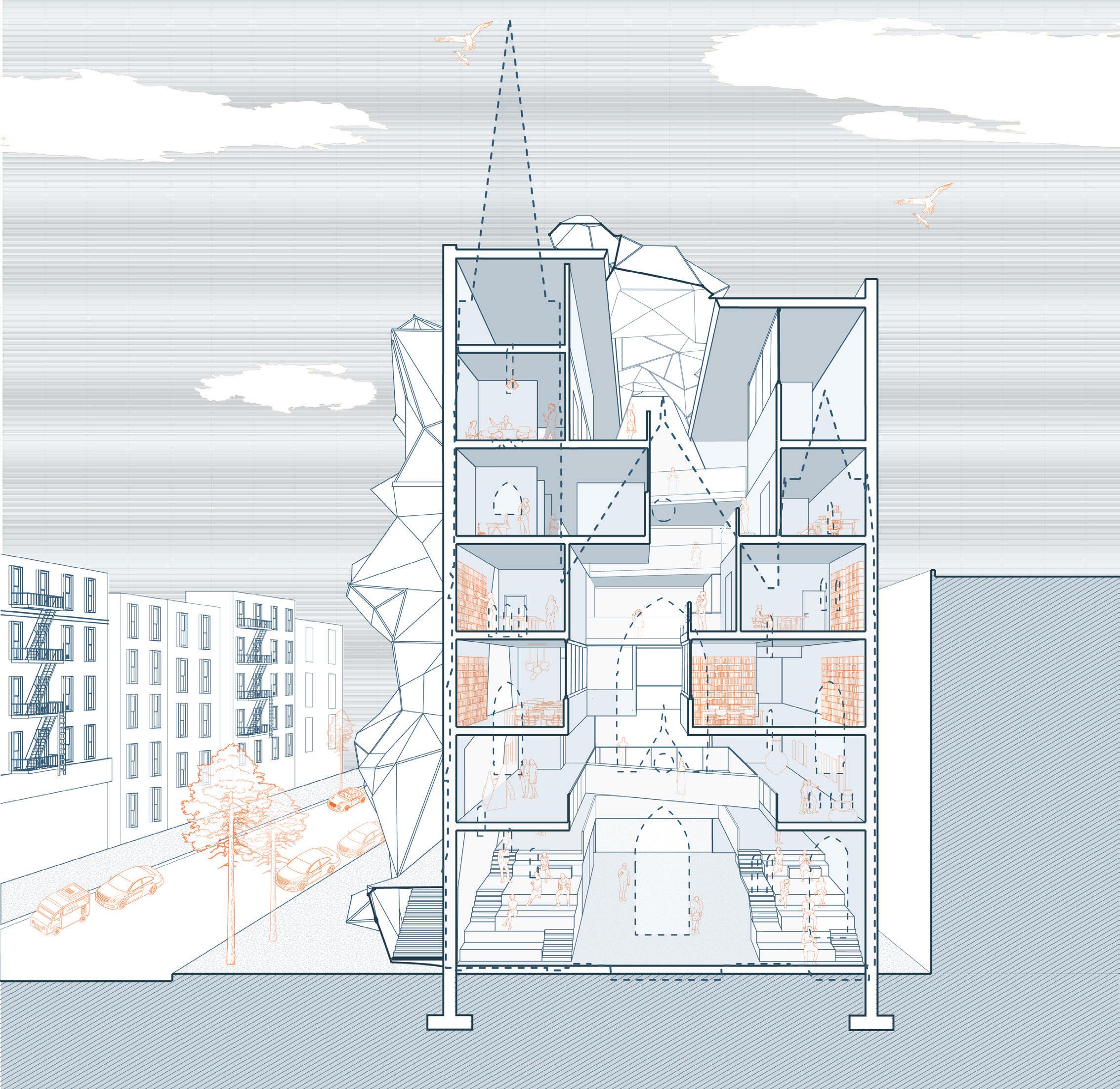 This is a cut sectional axon perspective, trying to show the human activities inside the building, the activities happen between inside and outside, both horizontally and vertically. People can clearly see the programs and functions for each floor and how people are able to access from inside to outside to the road.