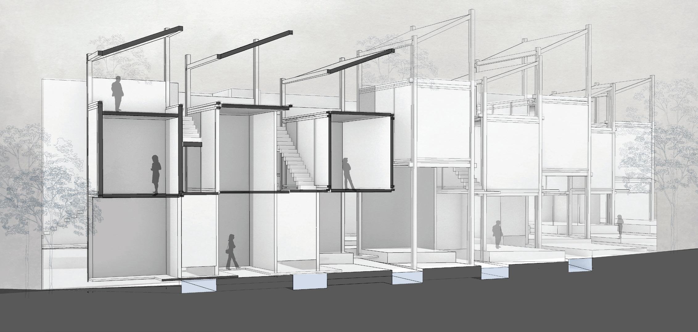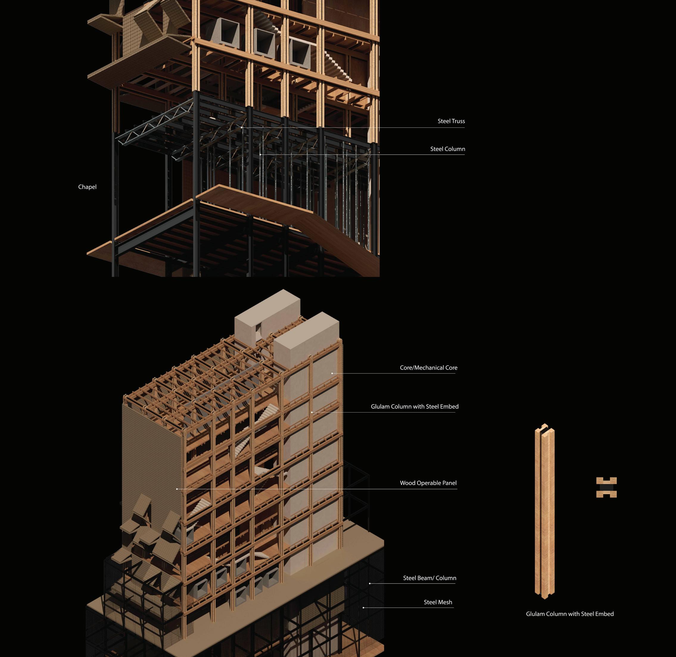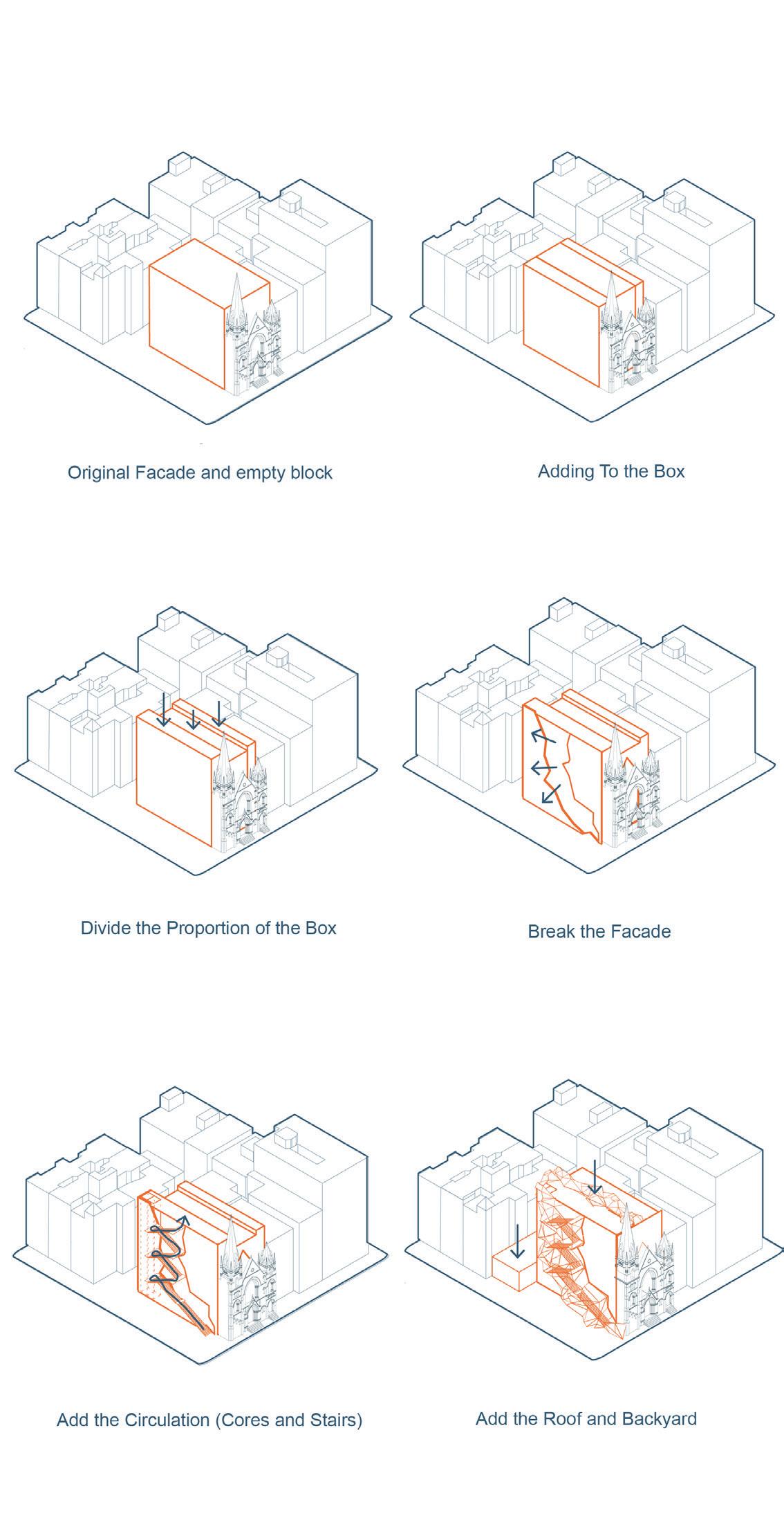 This is a cut sectional axon perspective, trying to show the human activities inside the building, the activities happen between inside and outside, both horizontally and vertically. People can clearly see the programs and functions for each floor and how people are able to access from inside to outside to the road.