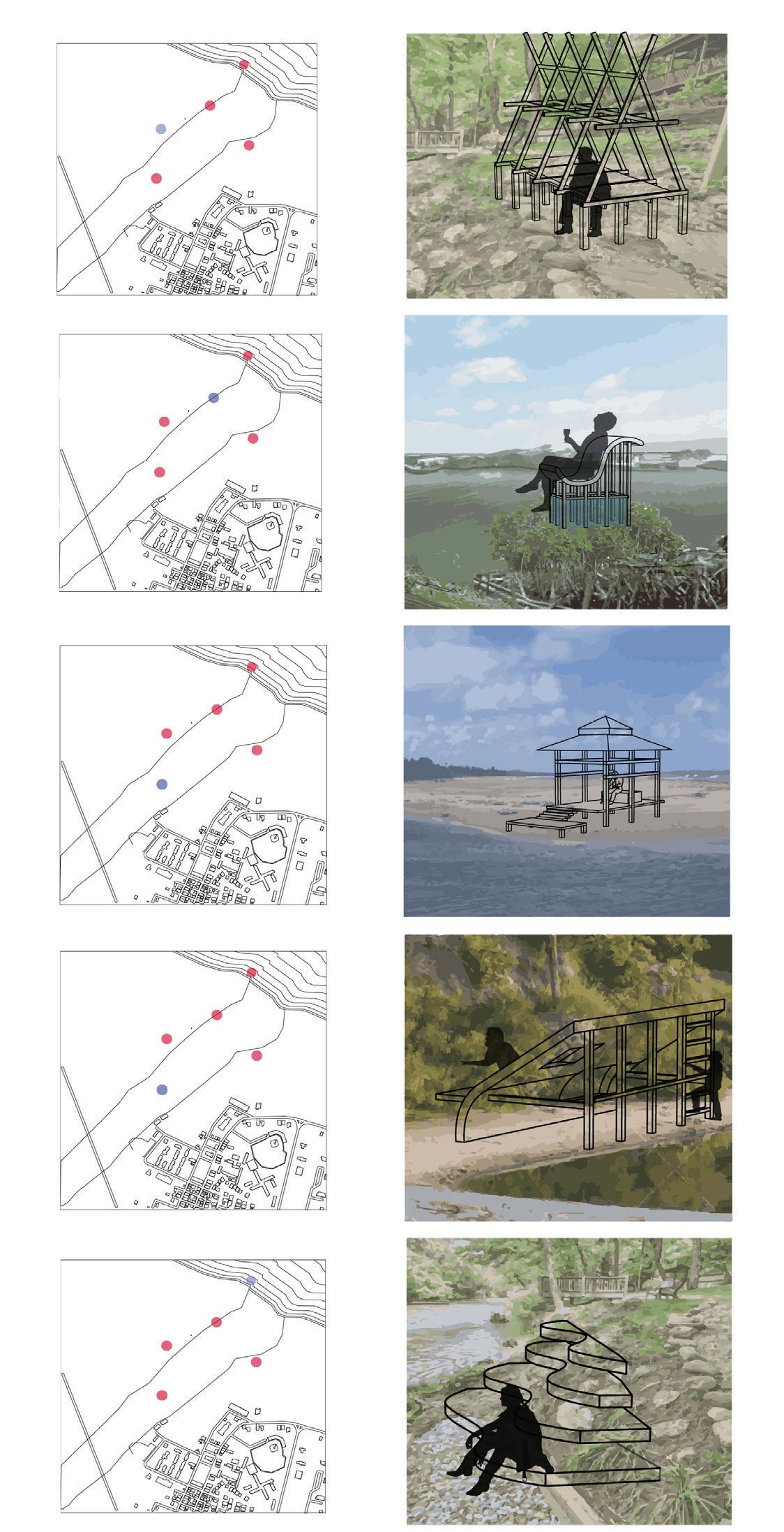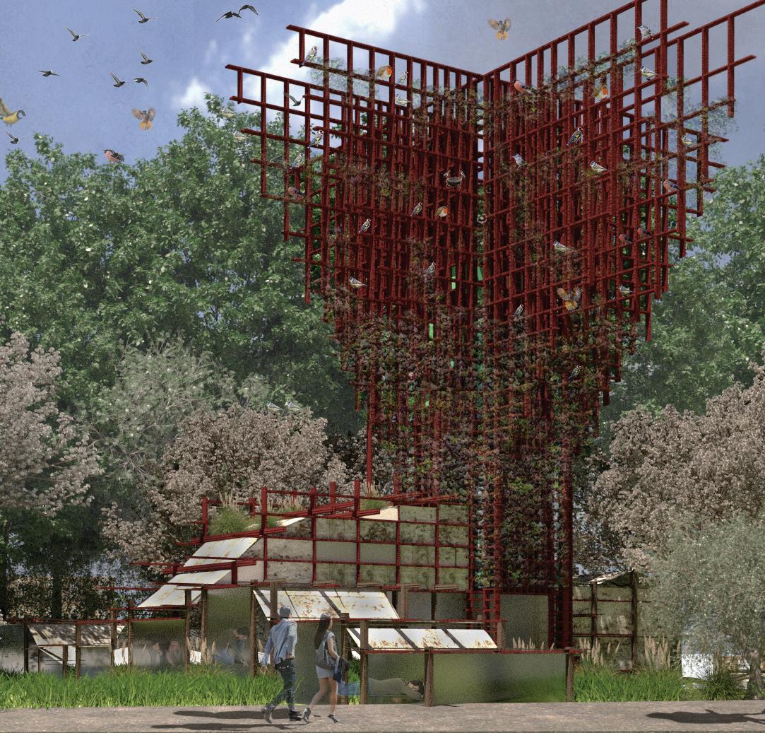 Here are some rendering perspectives of our design within the context, and left show the human eye view versus the bird eye view on the right. Why the color red for our design structure one might ask? The bright red is intended to be a stand-out feature for humans against the green context, while for the non-human inhabitants of the site, the structure disappears into the natural environment. Birds only see three colors: UV, blue, and green, whereas humans primarily see blue, green, and red.