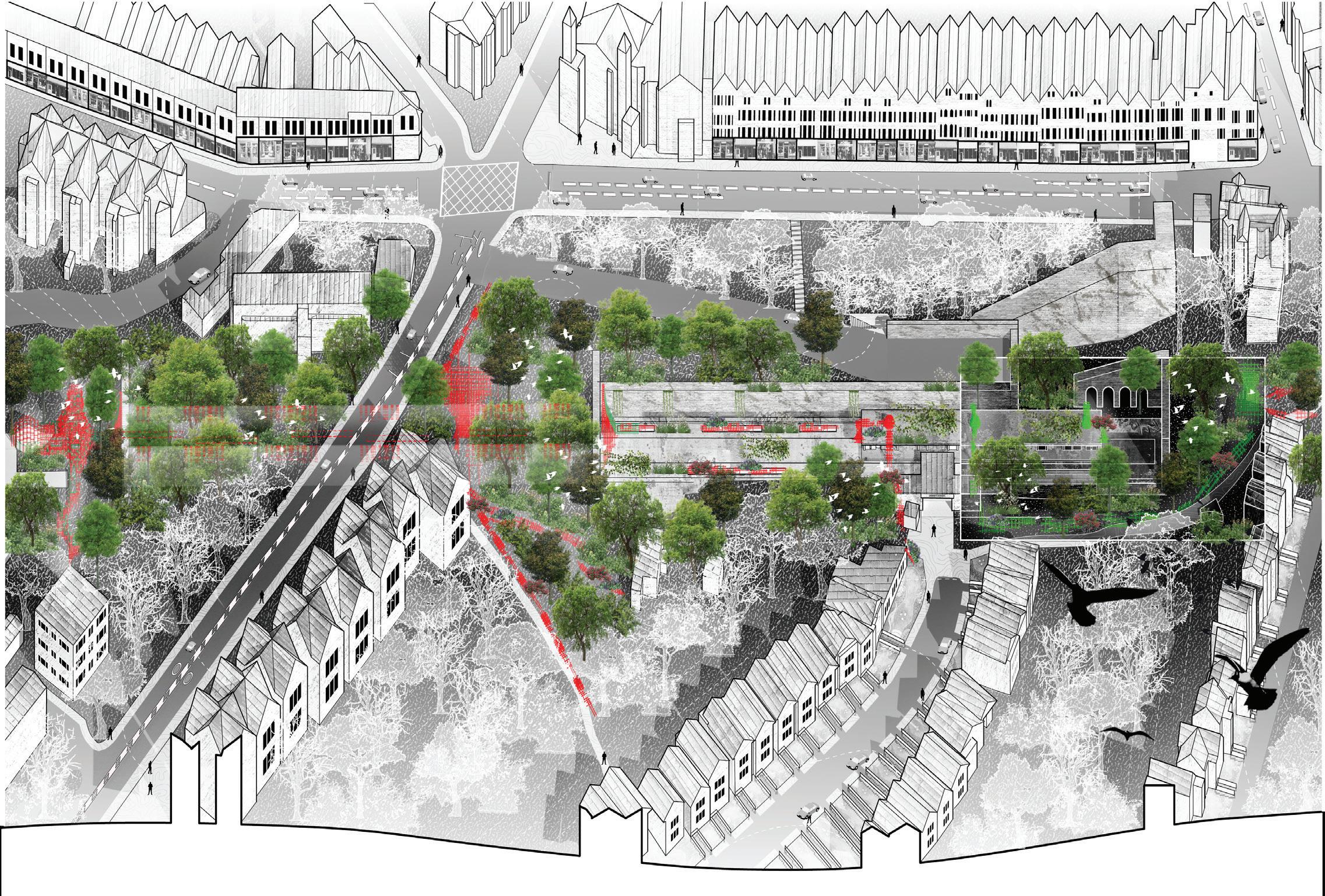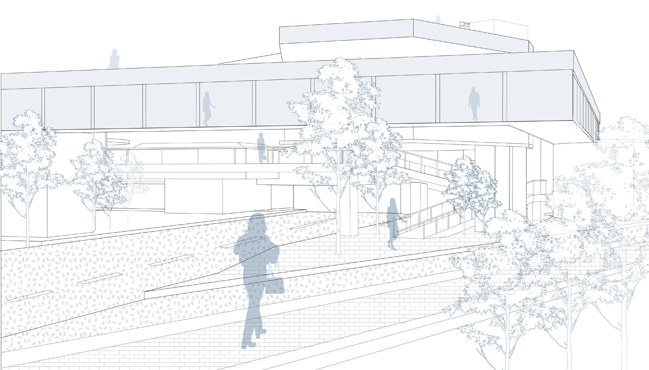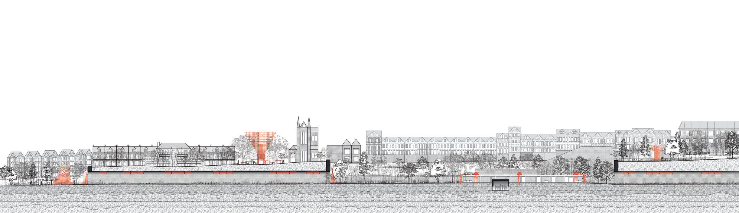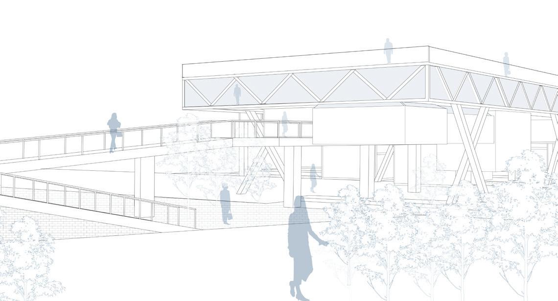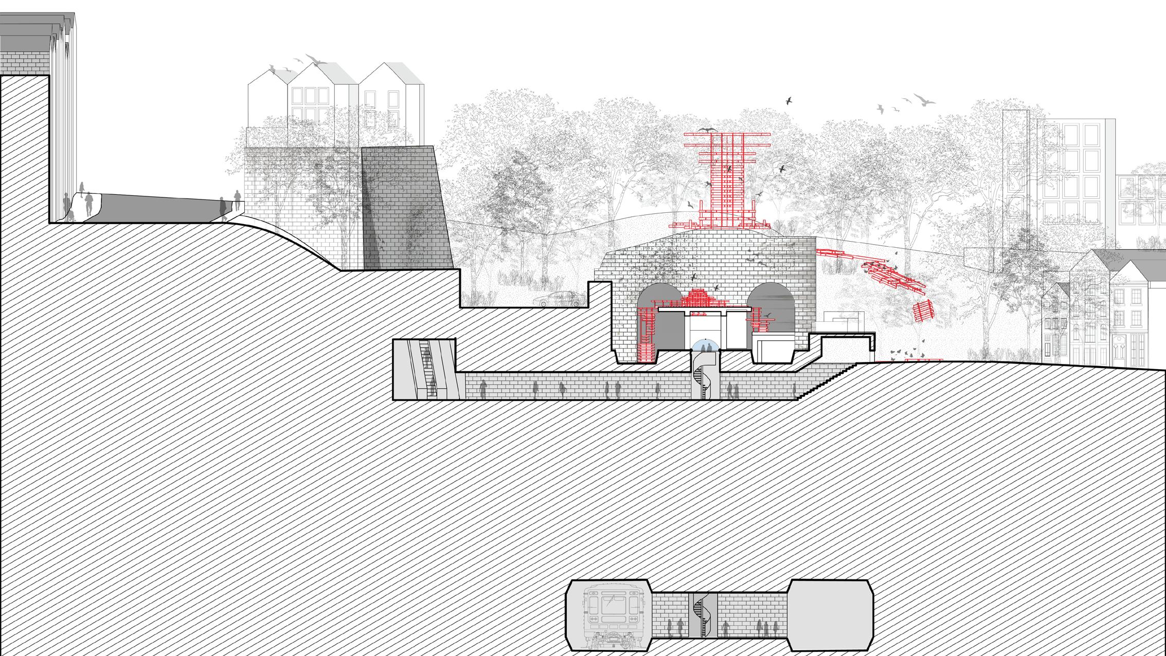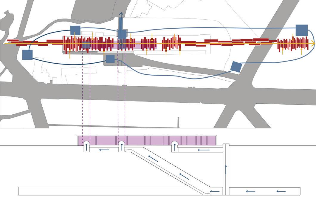 This short section shows how our design relates to the underground station. People can access the station canopy level from the ticket hall and view the center of the site from transparent bubbles.