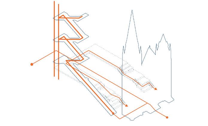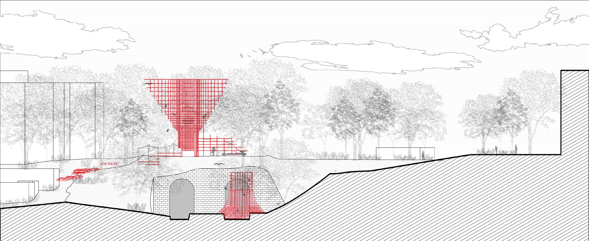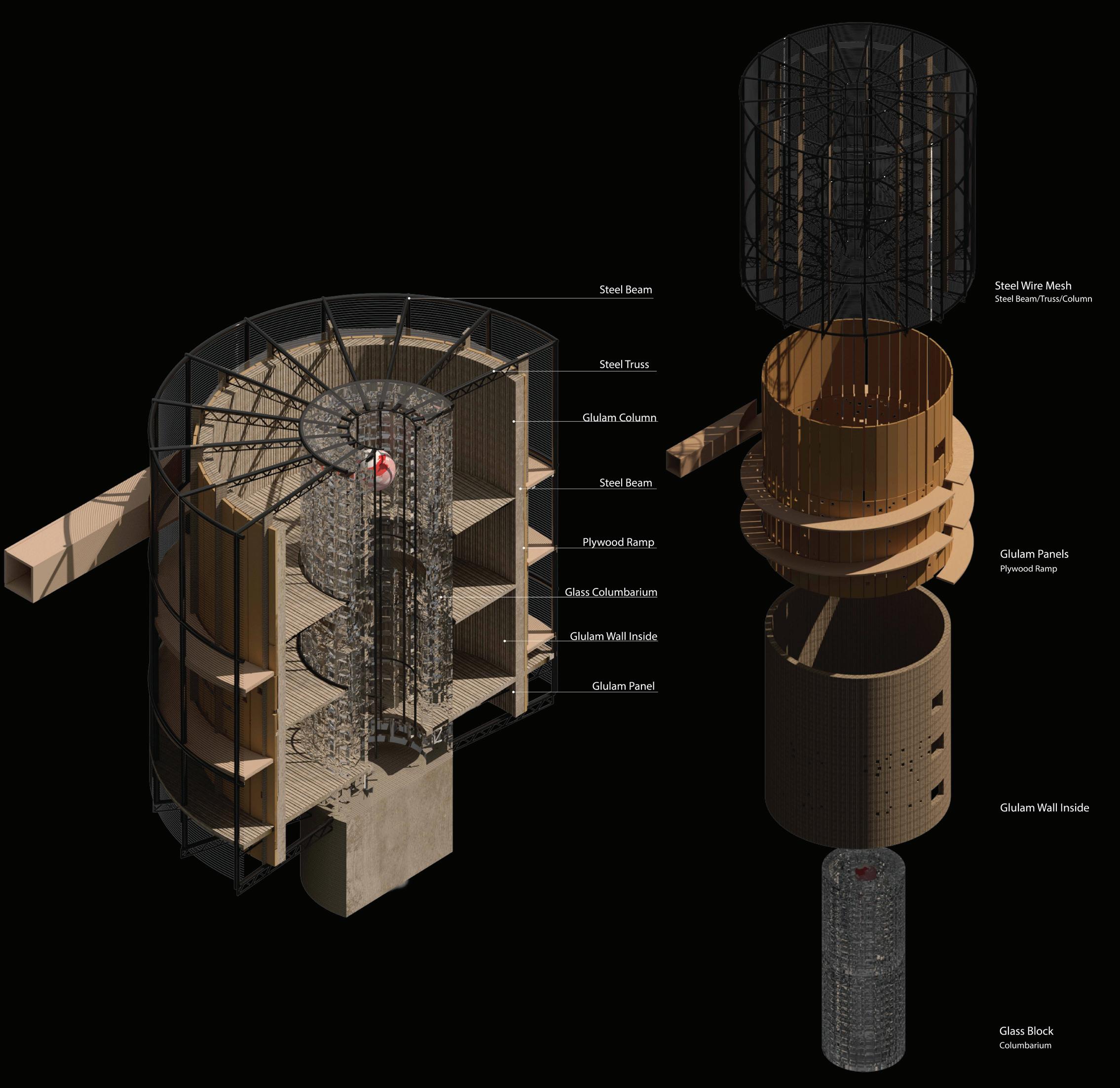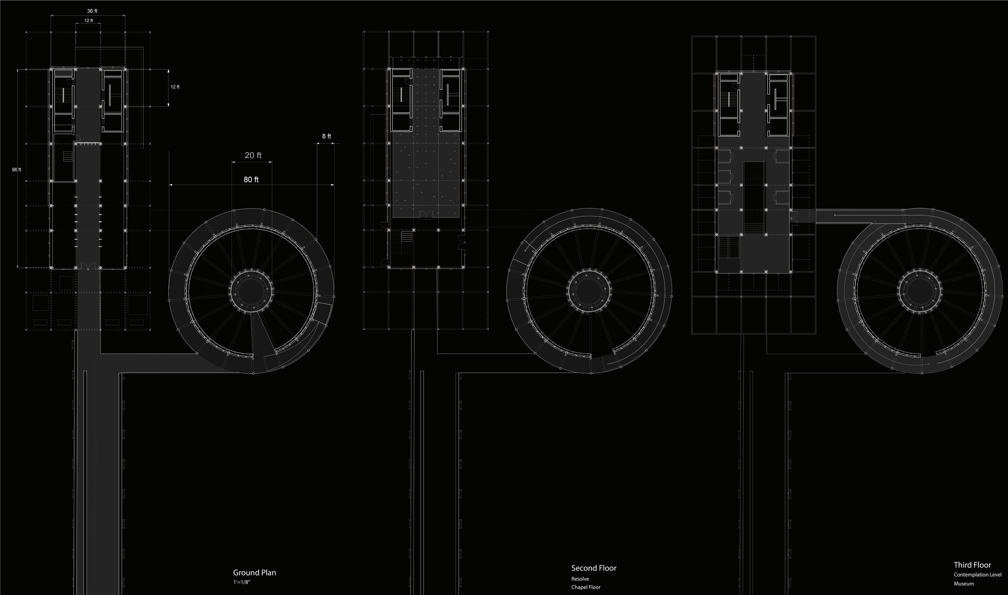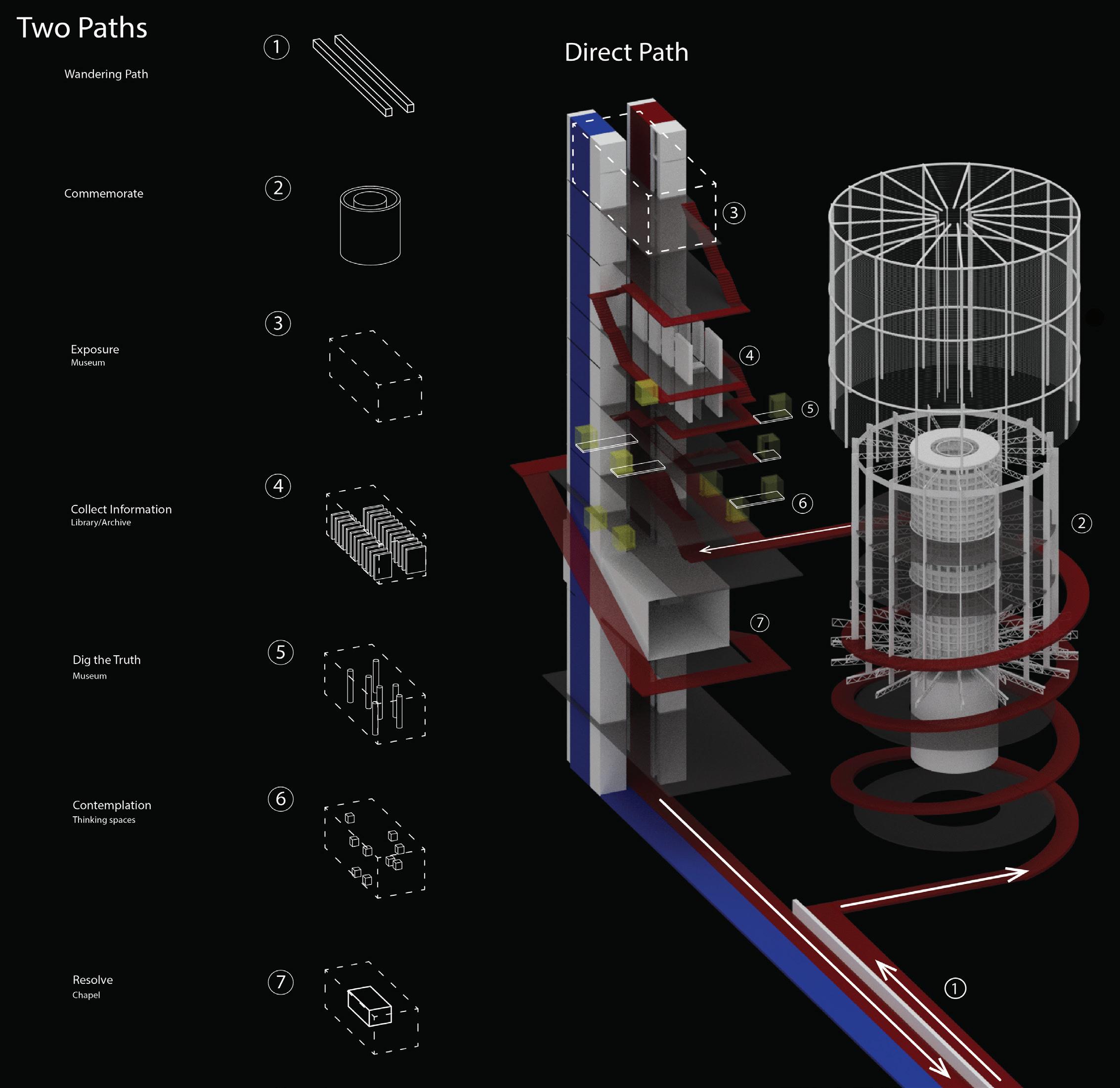 The circulation of the project exists along two dual paths, representing the dual perspectives towards the event. The direct path goes directly to the back of the tower to be sent to the top of the tower at the beginning of the sequence. The wandering path meanders through the columbarium and eventually makes its way to the center of the tower, where individuals are able to explore and direct themselves through the program. The museum sequence is informed by our own learning experience of the content of this event through exposure, learning, and contemplation.