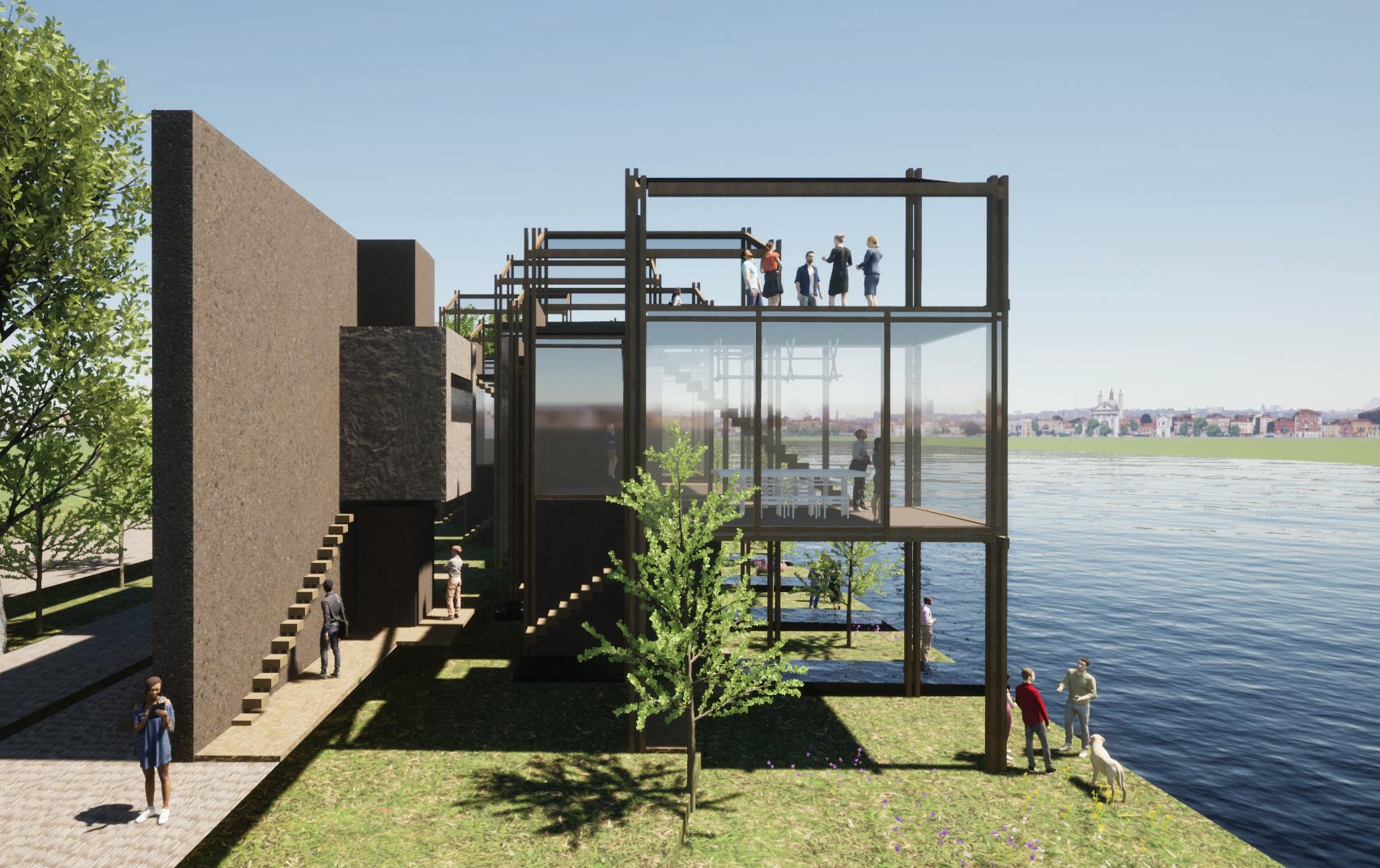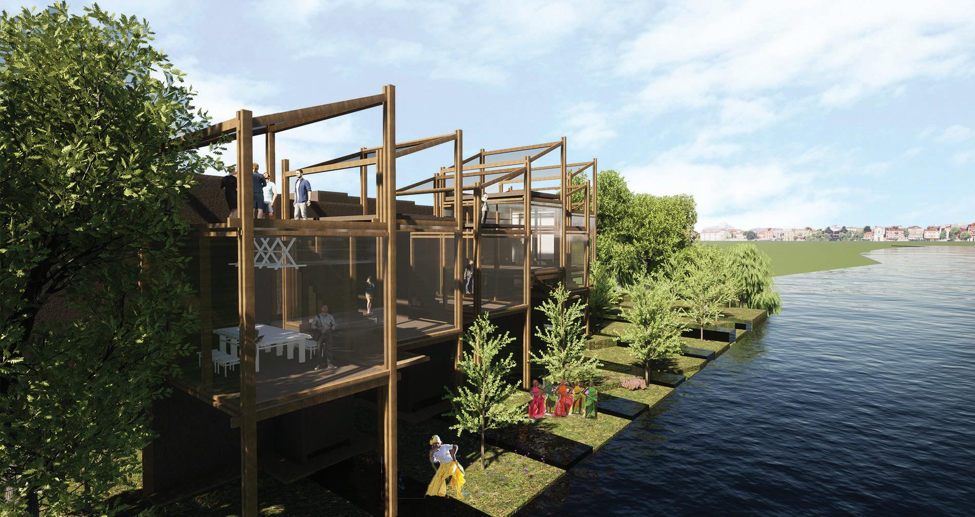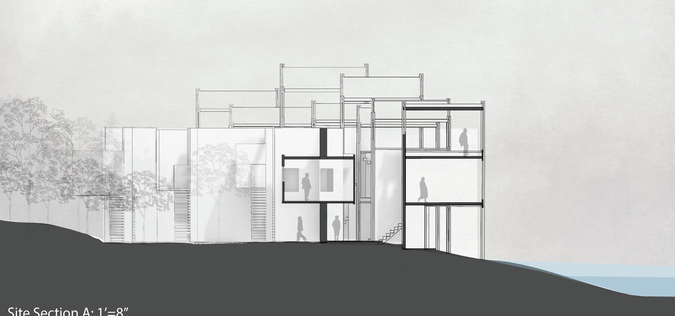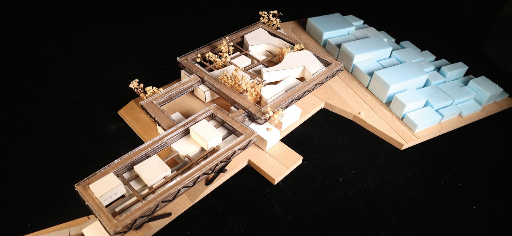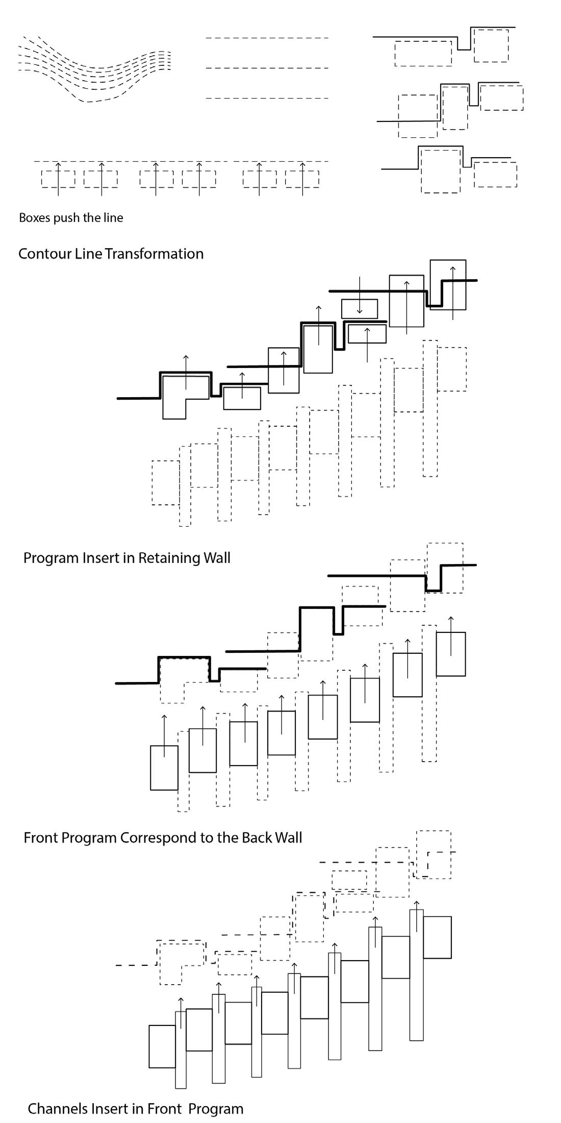 The front part of the design, set as the major classrooms, adopts the stilts structure idea, which are high lifted from the ground, and the first layer of retaining wall happens here. I use the translucent material that allows people inside the classroom are able to observe different views of the river. The back part the design was the second layer of the retaining wall. The programs here serve as the administrative offices. The administrative offices serve the classroom in the front. The bridges in between not only allow people to walk from administrative offices to the classrooms, but also people are able to observe the water on the platform.