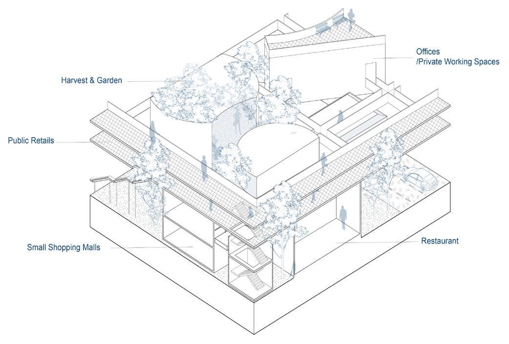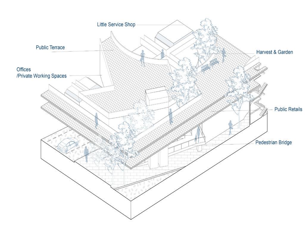 The project is a commercial concentrated center with varieties of retail stores/ markets, restaurants, public service, shopping center, and recreational areas, comined with the garden roof on the top, harvest and more private area like staff working and operating spaces. Site existing pedestrian bridge includes in the design. The main design ideas: from the ground plan all the programs seem to separate from each other, but the taller people go all the programs bring people united together; “Street in the sky”; top down and bottom up are used to break the local spatial structure and let the people decide how they want the buildings to be shaped like. The two rectangulars are the top down element, and the irrgular shapes that interlocked and overlayed are the bottom up element. Moreover, the building allows people to transport themselves to both top and bottom of the building with flexibility.
