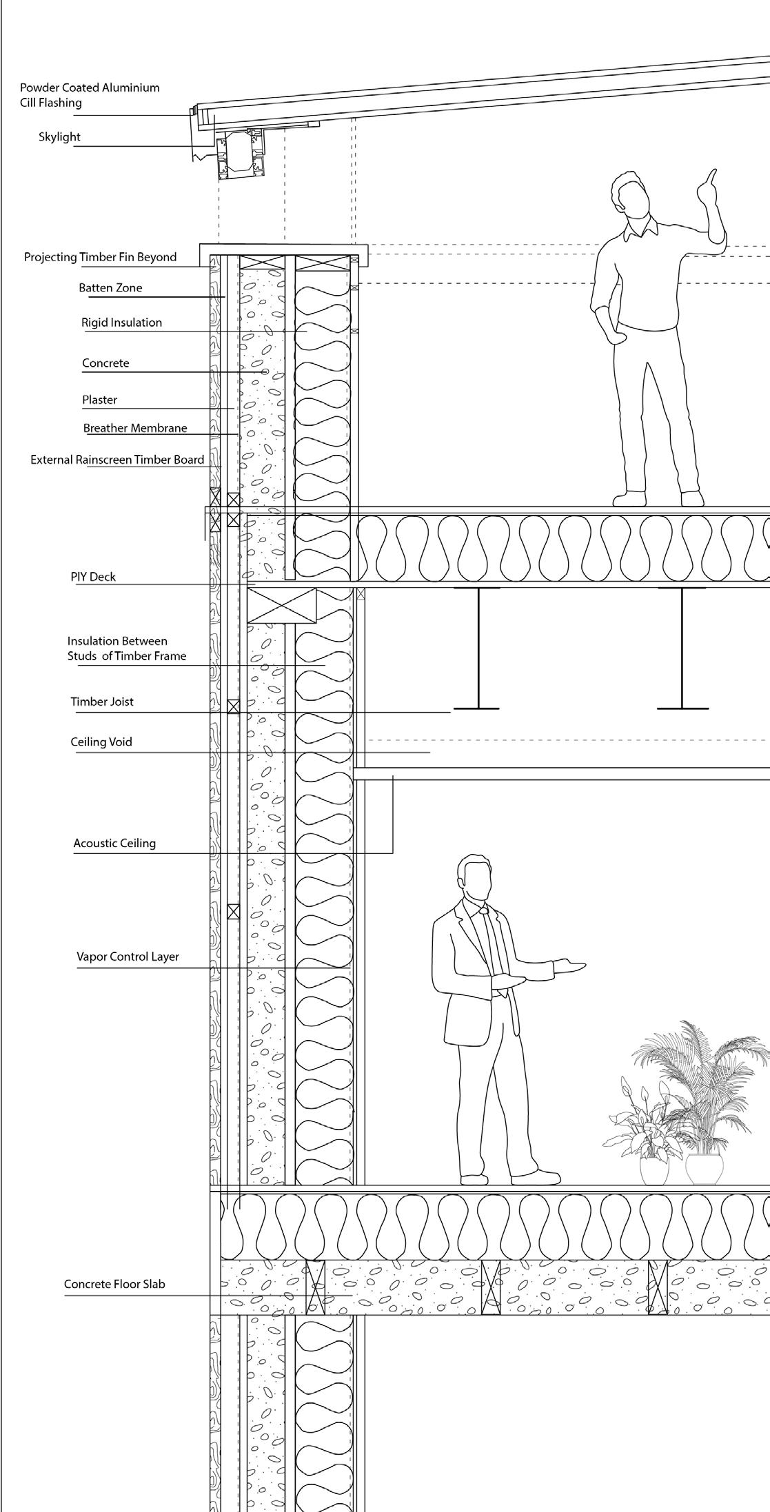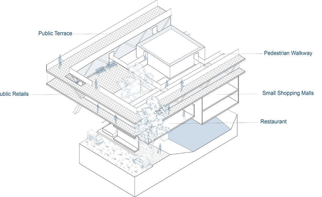 -According to the ground plan, the back infill garden, the middle atrium, and the front void spaces connect to each other, allowing people to enter and exit flexible from both front and back. The engagement of the headquarters and the garden spaces would give the citizens and people work inside have a sense of ownership of the space. On the weekend, The atrium on the ground floor can hold some temporary market selling for the indigenous people.