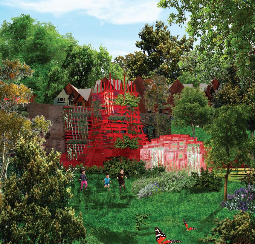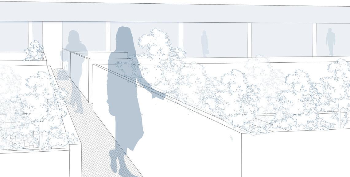 The enclosure opens and closes within the mesh of the encasing garden creating layered moments of exposure and obscurity.