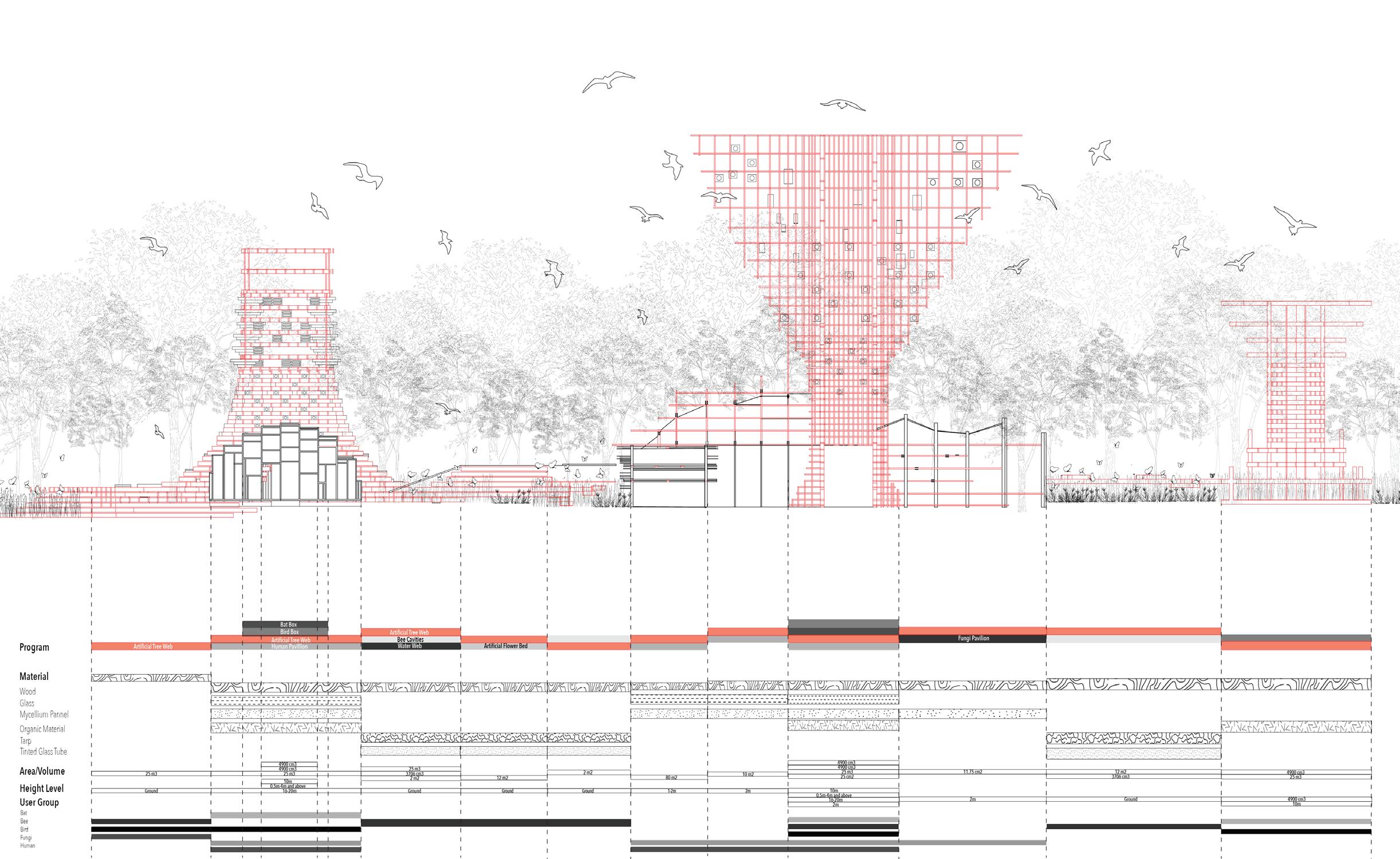 The composite elevation drawing represents the specific contents of the project including the program, material breakdown, main animal users, and the area and volume of the installations. The drawing provides iterations of how different animal typologies may aggregate together to form different relationships of cohabitation.