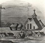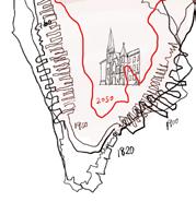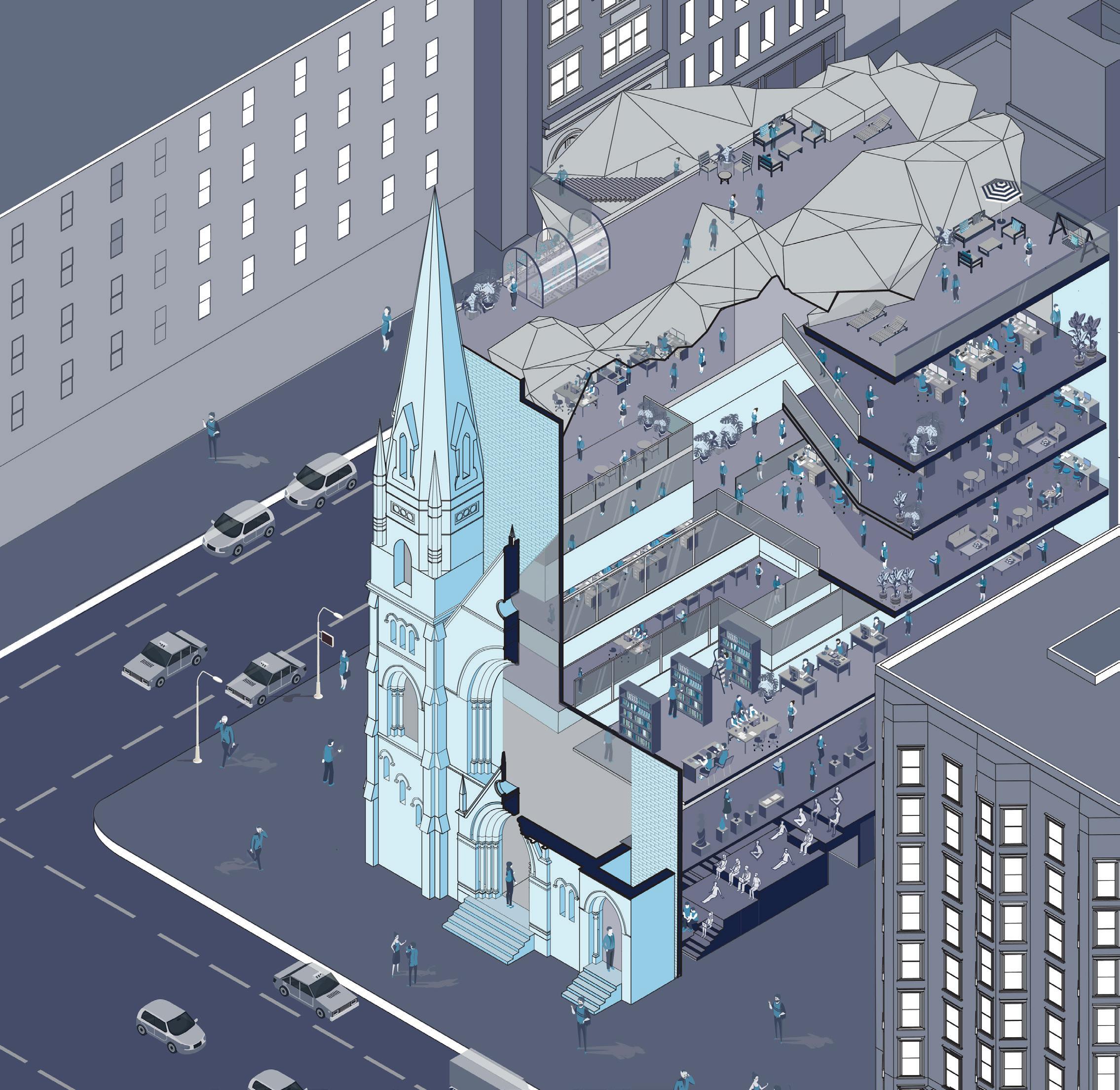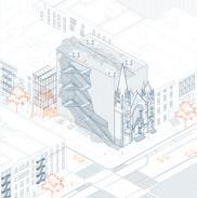 -Language: two splited blocks wrapped, using rotated modern concrete bricks, around the dynamic glass structure, emphasize the atrium facing the middle of the church facade, allow sunlight to shine down.
