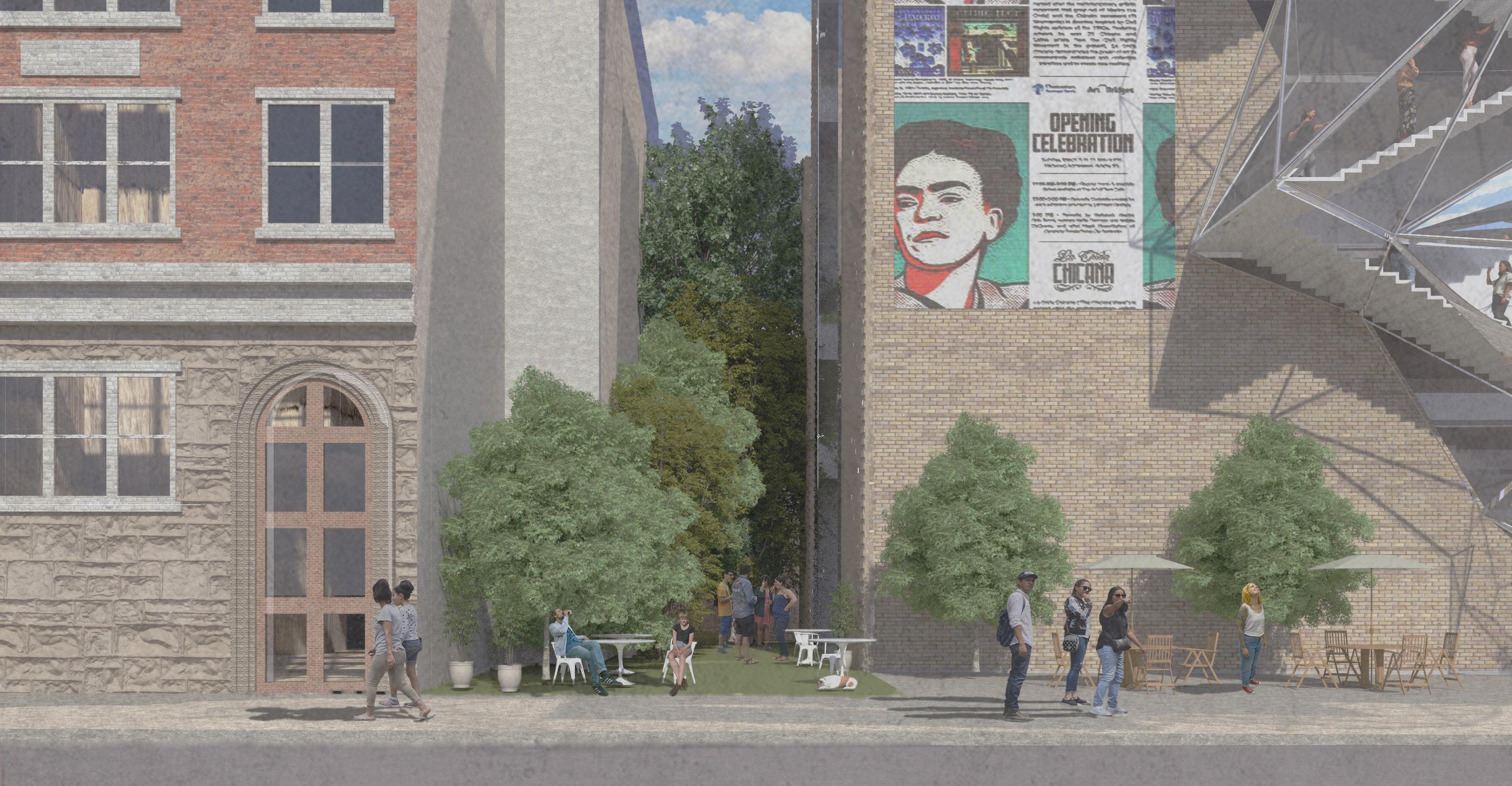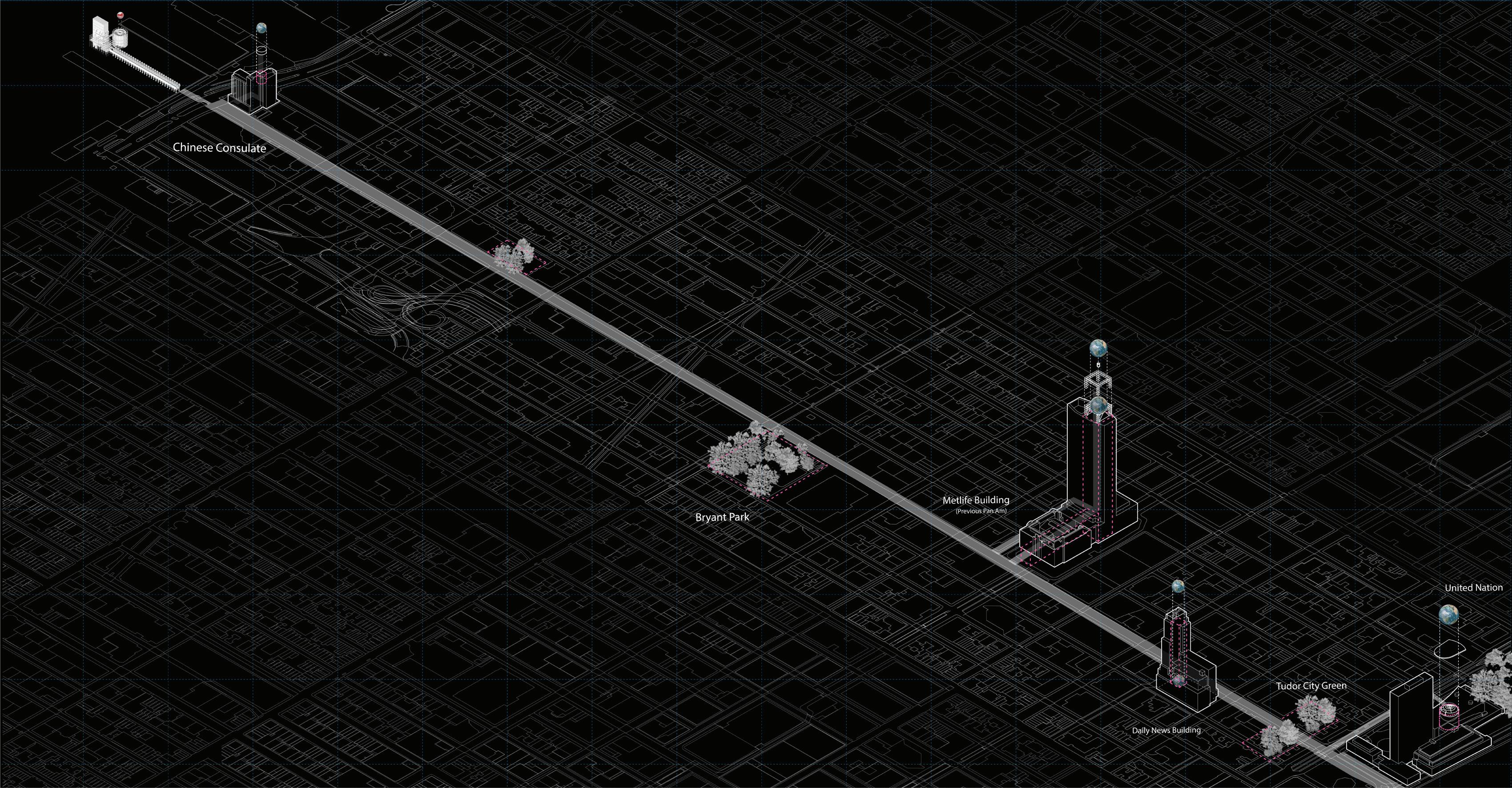 This project draws from towers of New York City and Spherical spaces of gathering along 42nd st to express the concepts of collective conversations to enforce the ideas of cooperative discovery and learning. The forms of the tower and circular cylinder serve as replication of these spaces along the street. As a testament to this context, a small globe suspends on top floor of the spherical building, highlighting China and Beijing, the true site and context of this event.
