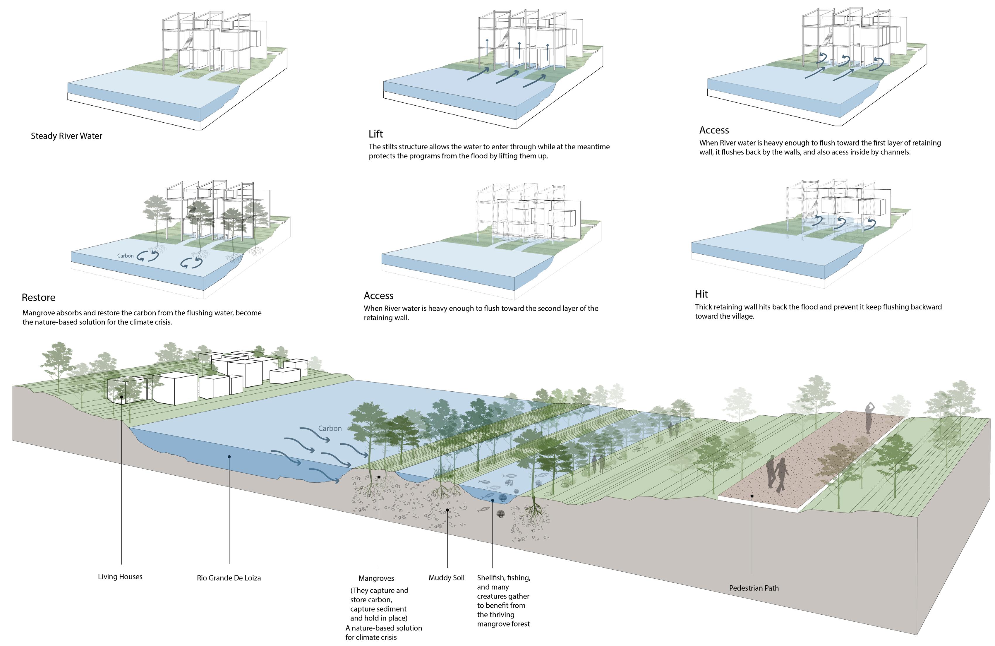 This is an evironmental issue focused desigin. The environmental issue I focused on was the flooding and land erosion that happen in Loiza, Puerto Rico. Because of the two environmental issues, two layers of retaining walls and stilts structure are the major elements of my design.