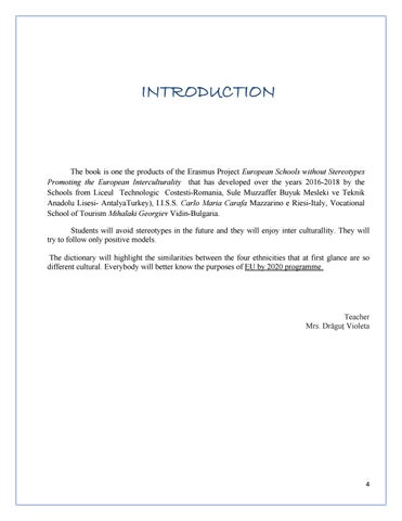 The book is one the products of the Erasmus Project European Schools without Stereotypes Promoting the European Interculturality that has developed over the years 2016-2018 by the Schools from Liceul Technologic Costesti-Romania, Sule Muzzaffer Buyuk Mesleki ve Teknik Anadolu Lisesi- AntalyaTurkey), I.I.S.S. Carlo Maria Carafa Mazzarino e Riesi-Italy, Vocational School of Tourism Mihalaki Georgiev Vidin-Bulgaria. Students will avoid stereotypes in the future and they will enjoy inter culturallity. They will try to follow only positive models. The dictionary will highlight the similarities between the four ethnicities that at first glance are so different cultural. Everybody will better know the purposes of EU by 2020 programme.