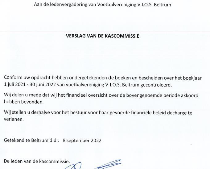 5. Jaarverslag 2021 - 2022 ▪ Mei 2022 ❑ Anny Helmers stopt als VertrouwensContactPersoon. Iris Groot Zevert neemt haar functie over samen met Marlies Stoteler. ❑ Jos Porskamp regelt samen met LumenXL nieuwe trainingspakken en meer voor Dames 1 ❑ Organisatie Ouderavonden ❑ Informatieavond speelwijze jeugd V.I.O.S. ❑ 14 mei VIOS-dag met huldiging van maarliefst 36 jubilarissen ❑ Contacten met DEO over eventuele samenwerking meisjesvoetbal worden opgestart ❑ Hassinkhof brengt bezoek aan sportpark De Sonders vv V.I.O.S. Beltrum | Ledenvergadering 2022