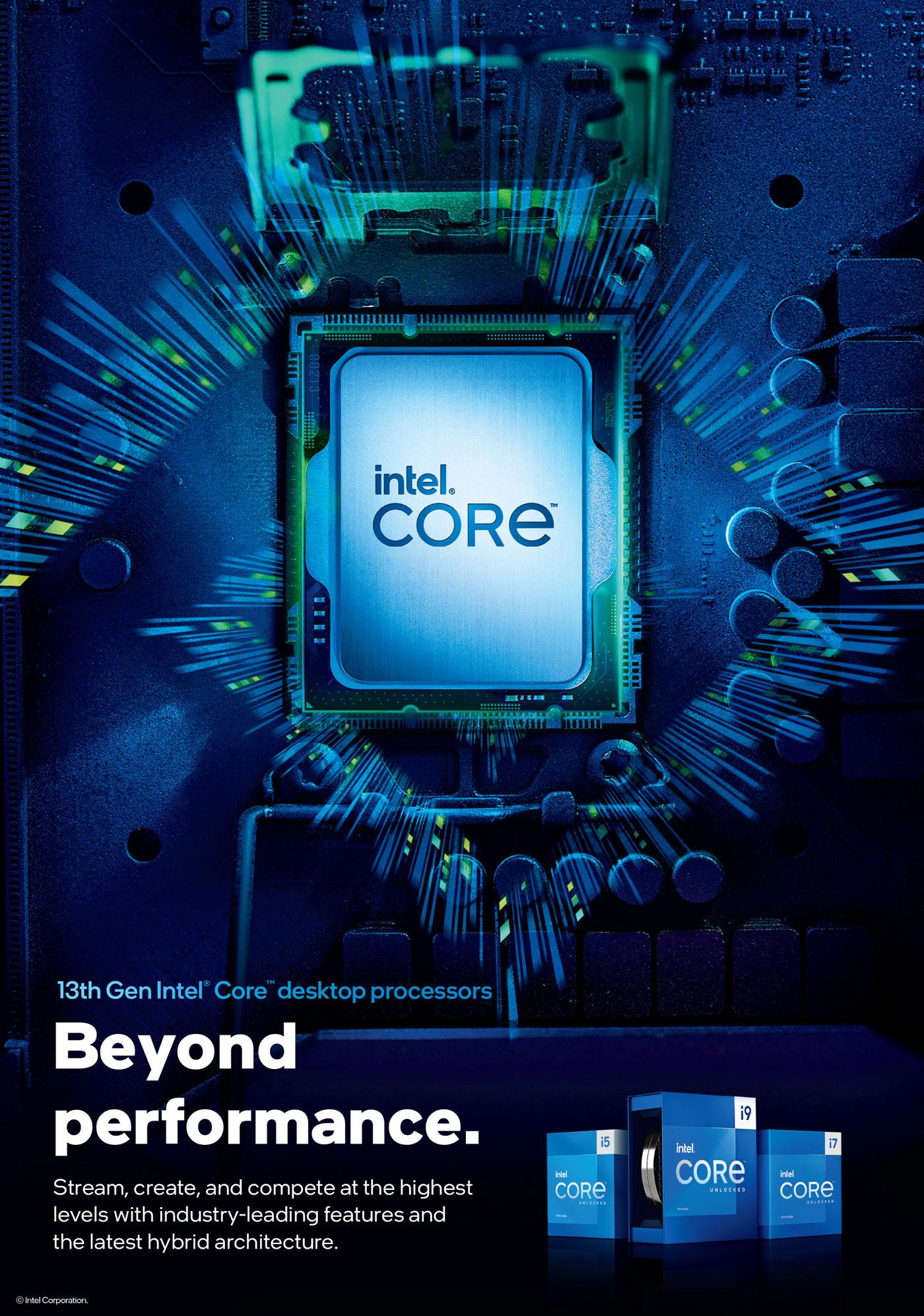 Not be outdone, Intel are hot on AMD’s heels with a release date later in October for the initial intake of the 13th Gen Intel® Core™ Processors for enthusiasts. Built on the Z790 chipset, the new processors include the i9-13900K, i9-13900KF, i7-13700K, i7-13700KF, i5-13600K and i5-13600KF and launch on the 20th October, with the other processors in the range having staggered release dates in to 2023. 1On Performance-cores. Performance varies by use, configuration and other factors. Learn more at www.Intel.com/ PerformanceIndex. 2Unlocked features are present with select chipsets and processor combinations. Altering clock frequency or voltage may void any product warranties and reduce stability, security, performance, and life of the processor and other components. Check with system and component manufacturers for details. 3600 series compatibility available on select motherboards only. Not all features present on all motherboards. Check with your motherboard manufacturer. 4Maximum memory speeds are associated with 1 DIMM per Channel (1DPC) configurations. Additional DIMM loading on any channel may impact maximum memory speed. Up to DDR5-5600 MT/s 1DPC UDIMM 1Rx8, 1Rx16 and DDR5-5200 1Rx8, 1Rx16, 2Rx8 on select SKUs. Maximum memory capacity is achievable with 2DPC configurations. Billed to go beyond performance for uncompromising gaming and multitasking. 13th Gen Intel Core Processors will feature up to 5.8 GHz max clock speed 1, 24 Cores (8 Performance-cores/16 Efficientcores), 32 Threads, be unlocked and overclockable 2, compatible with 600 and 700 series 3 motherboards, have a total of 20 CPU PCIe Lanes and compatible with both DDR5 and DDR4 4 memory Speed.