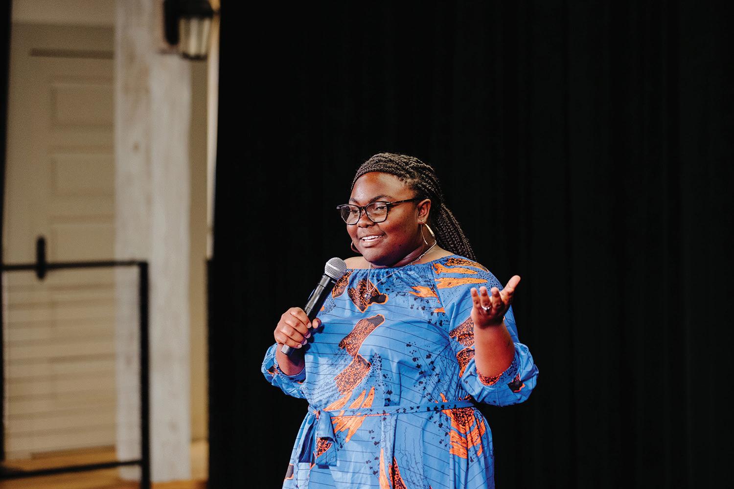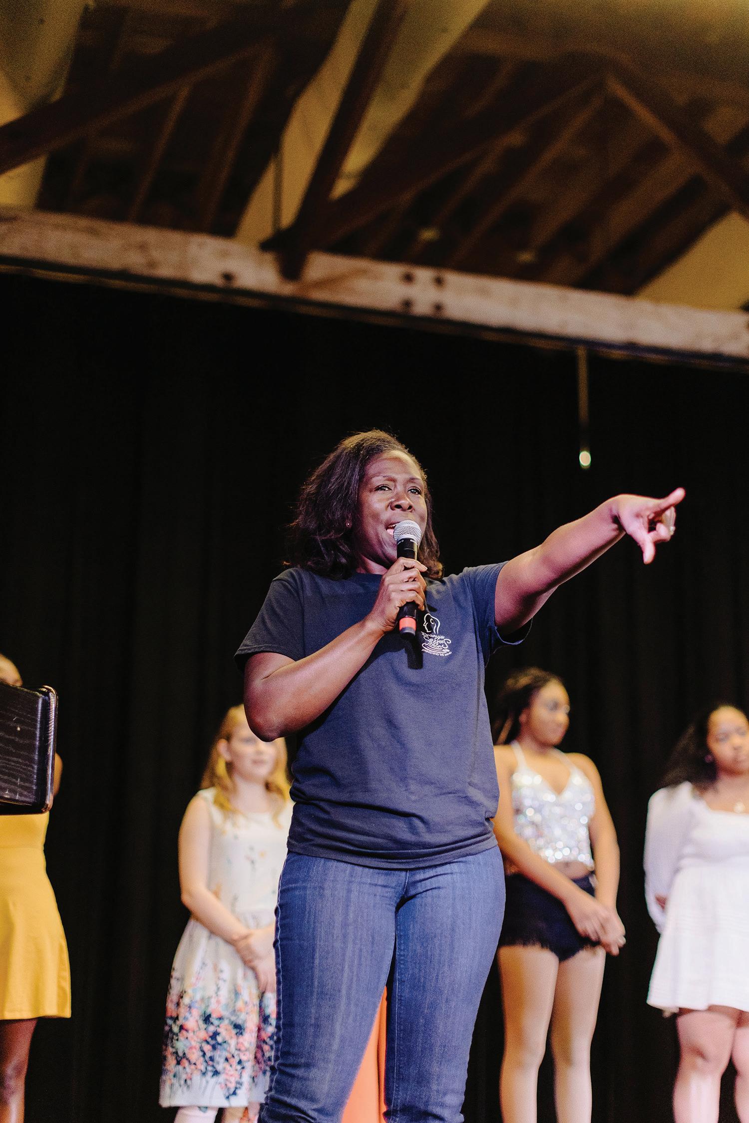Founder Carla Simon Angus speaking during the annual Summer Talent Show