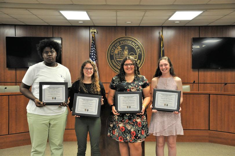 Kristian Mack of Darlington High School, Grace Myers of West Florence High School, Megan Atkinson of Lake City High School, and Karson Byerly of Hartsville High School Chief Allen Heidler of the Florence Police Department and Allison Carraway of the Terrence F. Caraway Foundation awarded four area high school graduates with the Sergeant Terrence Carraway Memorial scholarship, during a small ceremony in the City Council Chambers this morning. The 2021 recipients of the scholarship are Karson Byerly of Hartsville High School, Kristian Mack of Darlington High School, Grace Myers of West Florence High School, and Megan Atkinson of Lake City High School. Each graduate received $1,000 to go toward higher education expenses. Established in January of 2019, this need-based scholarship honors the life and work of Sergeant Terrence Carraway, whose watch ended October 3, 2018. The joint effort by the Terrence F. Carraway Foundation and Florence Police Department is a commitment to the continuation of Terrence's passion to assist the youth in the Florence and Darlington areas to have a brighter future. Karson Byerly plans to attend Liberty University and major in Film. Kristian Mack intends to major in Sports Management at Coastal Carolina University. Grace Myers plans to attend Western Carolina University and majored in Forensic Science. Megan Atkinson intends to major in Criminal Justice at Clemson University. The recipients of the scholarship were selected from applicants from school districts in Florence and Darlington Counties, or a comprehensive review of their application high school transcripts SAT/ACT scores and their 500-word essay. Information regarding this scholarship is provided each year to all of the Florence and Darlington school district guidance counselors.
