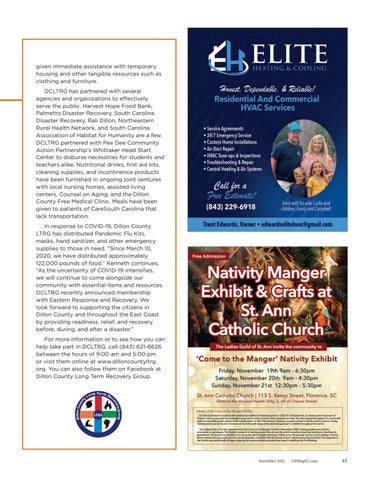 given immediate assistance with temporary housing and other tangible resources such as clothing and furniture. DCLTRG has partnered with several agencies and organizations to effectively serve the public. Harvest Hope Food Bank, Palmetto Disaster Recovery, South Carolina Disaster Recovery, Rali Dillon, Northeastern Rural Health Network, and South Carolina Association of Habitat for Humanity are a few. DCLTRG partnered with Pee Dee Community Action Partnership's Whittaker Head Start Center to disburse necessities for students and teachers alike. Nutritional drinks, first aid kits, cleaning supplies, and incontinence products have been furnished in ongoing joint ventures with local nursing homes, assisted living centers, Counsel on Aging, and the Dillon County Free Medical Clinic. Meals have been given to patients of CareSouth Carolina that lack transportation. In response to COVID-19, Dillon County LTRG has distributed Pandemic Flu Kits, masks, hand sanitizer, and other emergency supplies to those in need. "Since March 10, 2020, we have distributed approximately 122,000 pounds of food.” Kenneth continues, “As the uncertainty of COVID-19 intensifies, we will continue to come alongside our community with essential items and resources. DCLTRG recently announced membership with Eastern Response and Recovery. We look forward to supporting the citizens in Dillon County and throughout the East Coast by providing readiness, relief, and recovery before, during, and after a disaster.” For more information or to see how you can help take part in DCLTRG, call (843) 621-6626 between the hours of 9:00 am and 5:00 pm or visit them online at www.dilloncountyltrg. org. You can also follow them on Facebook at Dillon County Long Term Recovery Group.