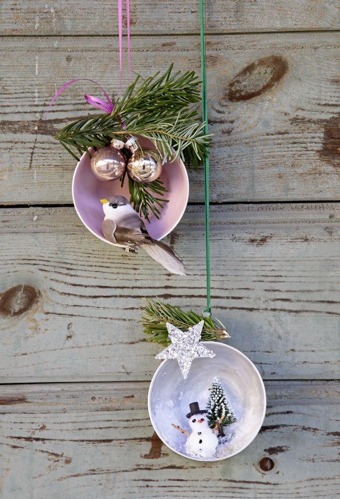 Was de kopjes goed en droog ze af. Schuur de binnenkant eventueel licht op met fijn schuurpapier zodat de verf beter hecht. Verf de binnenkant 2 tot 3 keer. Laat de verf tussendoor telkens goed drogen tot de gewenste dekking is bereikt. Knutsel vervolgens een klein sneeuwmannetje van pompons en karton. Plak dit, samen met kunstsneeuw en een miniatuurboompje, met het lijmpistool in het kopje. Klem het vogeltje op de rand van het kopje. Bevestig ten slotte een lintje aan het oor om het op te hangen en versier naar wens met takjes, kerstballen en een ster.