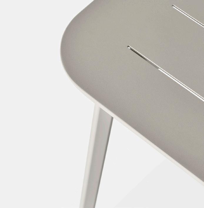 The aluminium tabletop is crafted to withstand outdoor conditions. A signature triangle edge adds volume to the clean profile, while grooves ensure rain drains easily from the surface.