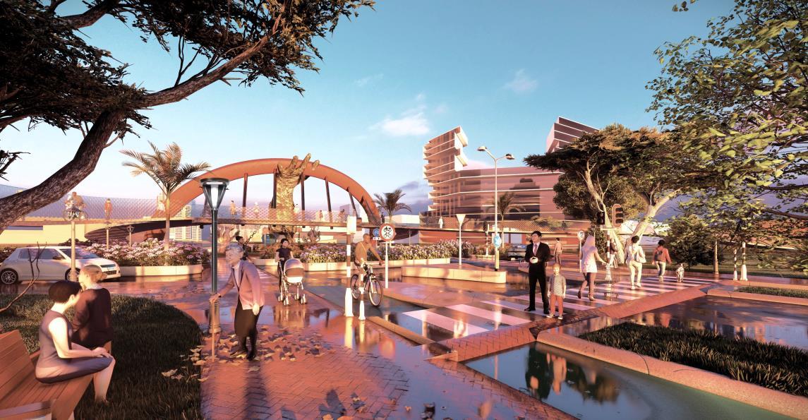 At the pivotal site intersection, an elevated pedestrian pathway serves as an observatory offering views of the surroundings, including the central green space