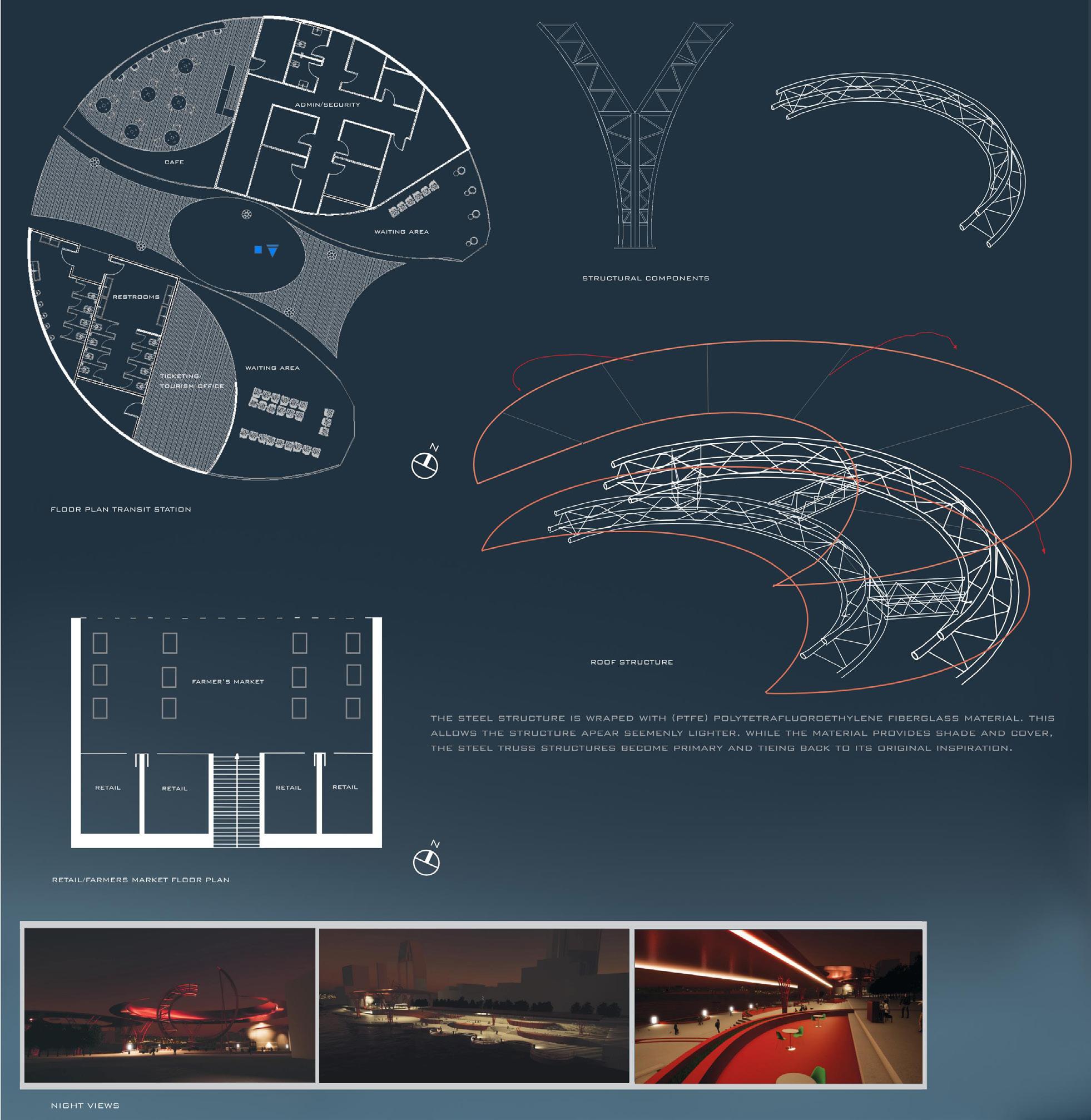 As a growing metropolitan area, the city of Nashville recognizes that a thriving mass transitsystem is critical for a thriving urban core. As such, the city has recently committed torevisioning public access and transportation in and around Nashville with a new, multi-modalmass transit system, including a revamped train system, bus system, as well as a new watertaxi system that will travel up and down the Cumberland River. Transportation is envisioned tobe free for minors, and low fare costs for adults.As a symbol of Nashville’s new commitment to revisioning public access and transportation inand around the city, the first redevelopment of this ongoing project will be “Broadway: RiverfrontStation.” This initial project is to be the face of the new initiative, a featured space with retail,outdoor space, and a farmer’s market, catalyzing the energy of this urban intervention and willalso serve as an opportunity to redesign the cultural landmark of where Broadway begins onFirst Avenue. This project will serve as a new cultural landmark forthe city as a complimentary addition to the downtown Broadway corridor while also addressingthe city’s parallel movement towards redeveloping the waterfront downtown. As Nashville continues to grow, the site is an opportunity for a unique experiential environment, soomething iconic. The concept for this proposal is two revitalize the riverfront by brinning new energy and exitment. A new gateway to the city fostering a strong community-oriented space and a new transit hub. Throuhg color and scale reinforces the idea of new, modern, city icon leaving its visitors and padestrians to engage with the site.