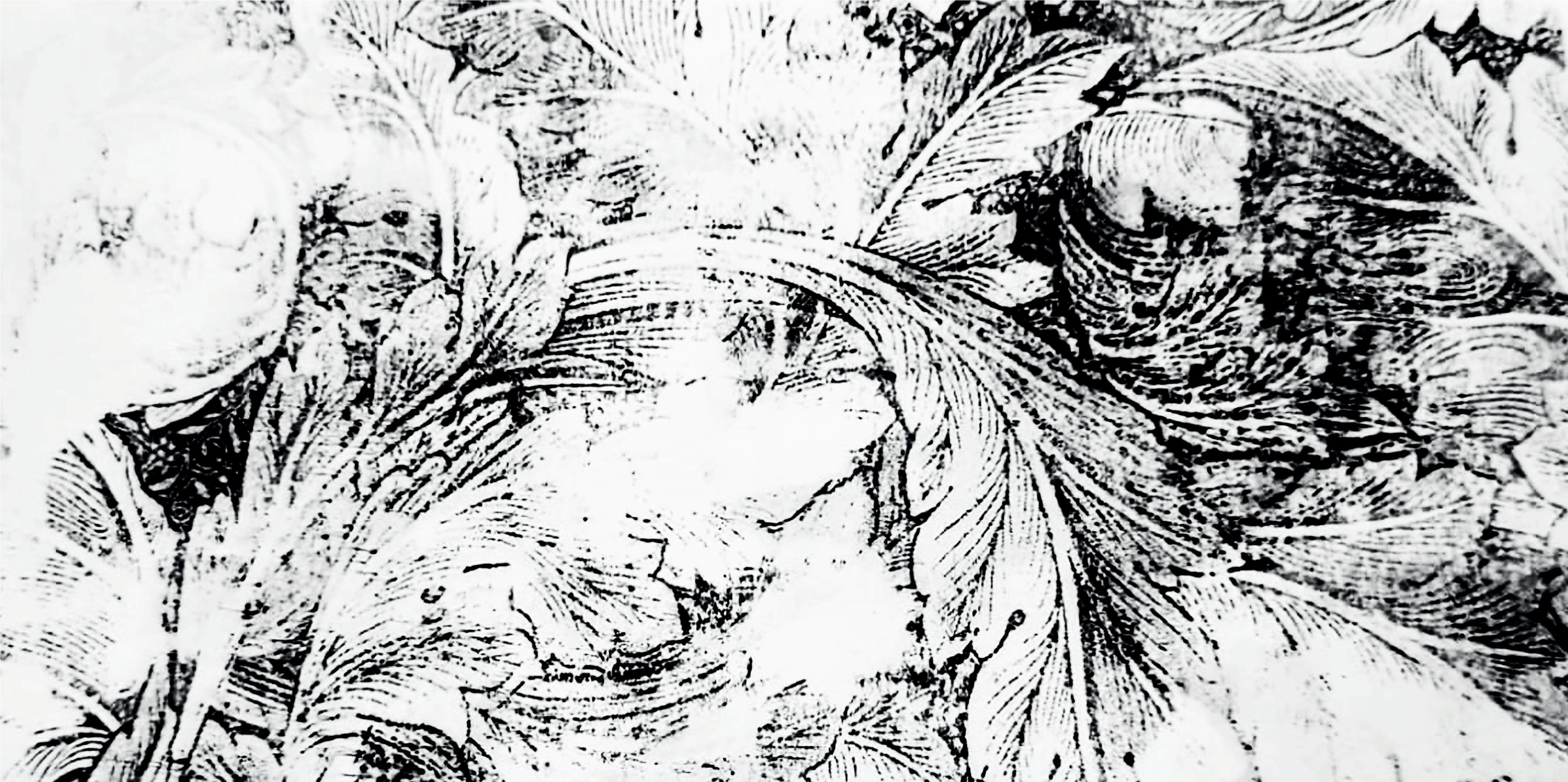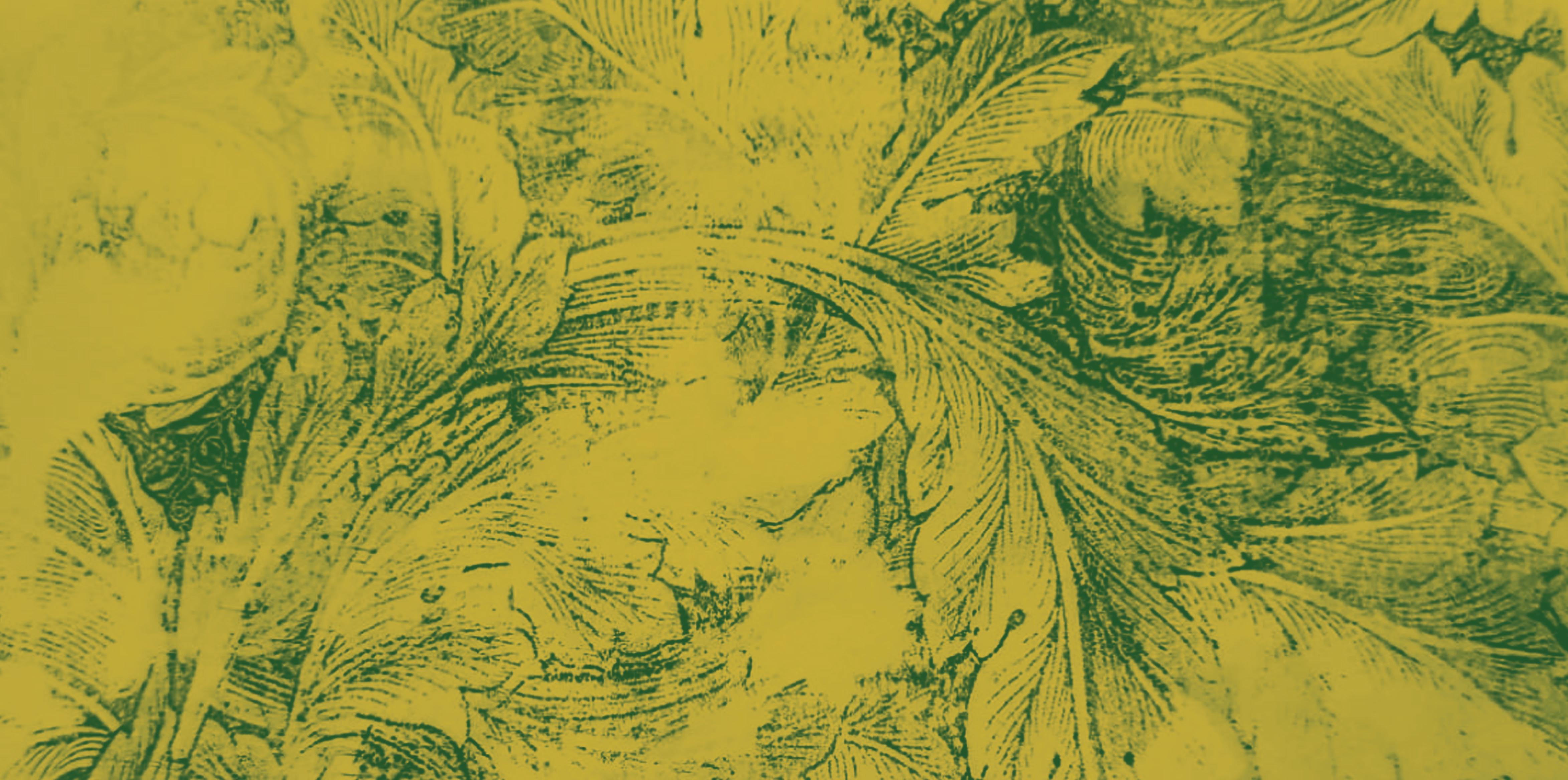 Las flores, hojas, tallos retorcidos, multiples insectos de color, sumados con, cabellos femeninos, rellenan todo el espacio.