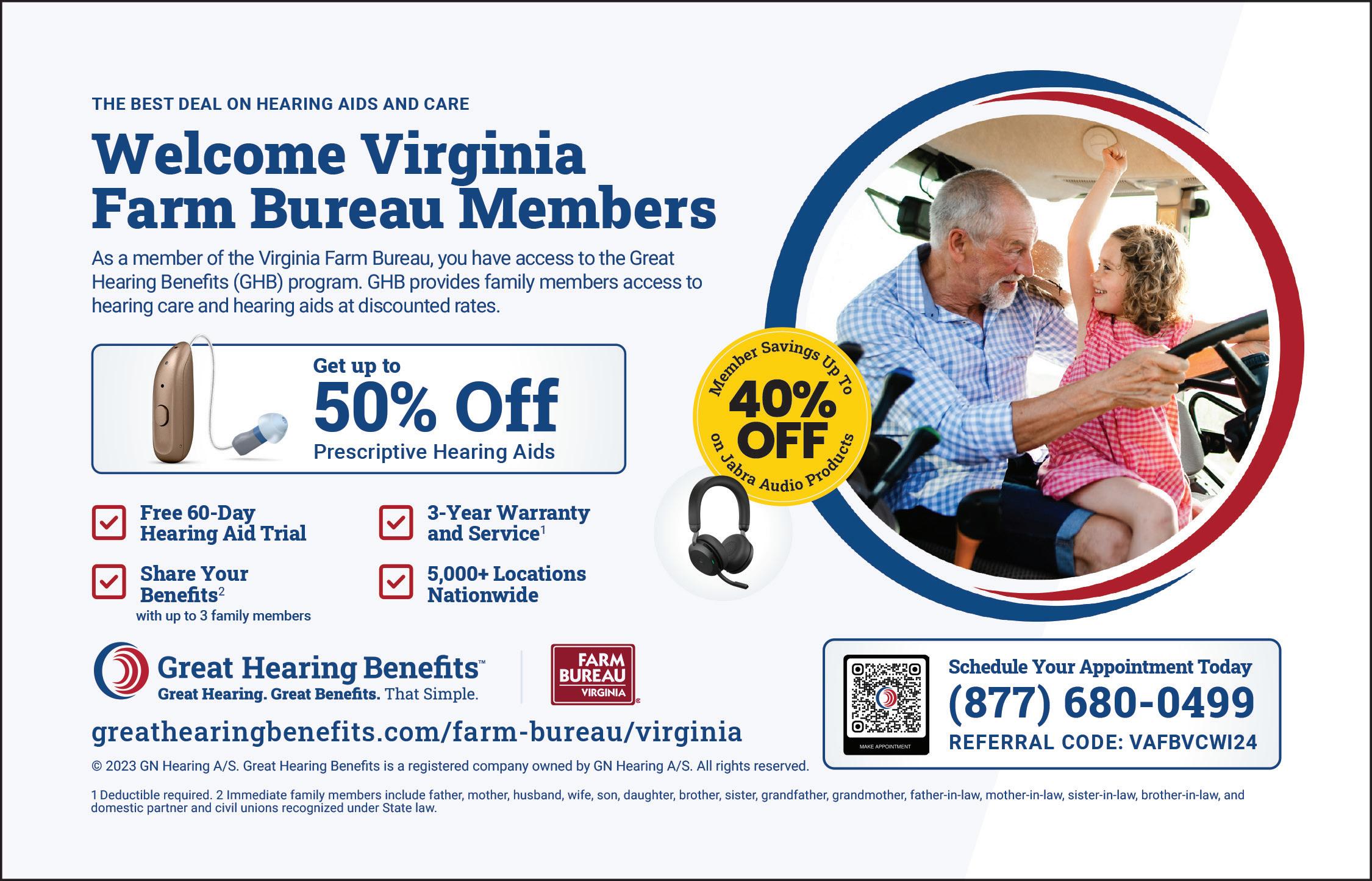 And now, Virginia Farm Bureau members can save up to 50% on top hearing aids provided through companies like Beltone, ReSound and Jabra.