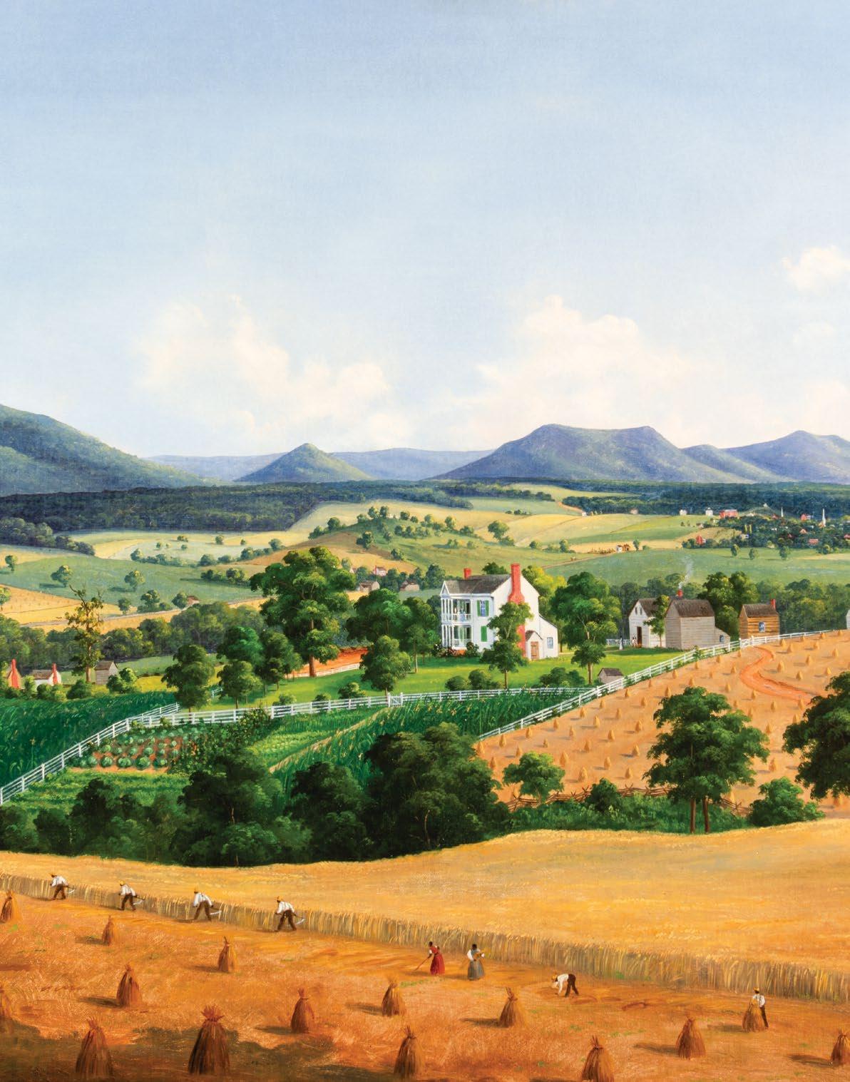 In Bellevue, Beyer captures the beauty of the landscape and intentionally demonstrates the prosperity of the painting’s sponsor. Dwarfed by the lush Blue Ridge Mountains, the Lewis house, kitchen, smokehouse, and garden stand near the center, while the golden fields of wheat, the source of much of the Lewis’s wealth, dominates the foreground. Beyer also depicts some of the 29 people the Lewis’s enslaved—both in the fields and around the house. Rendered in such detail, viewers can almost hear the scythes as they cut through the
