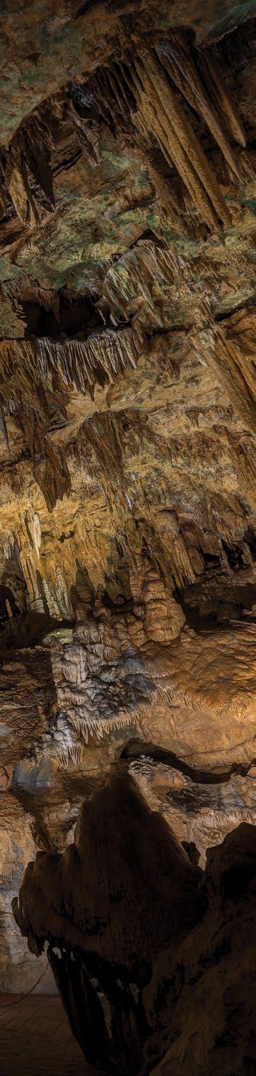 manganese dioxide and copper compounds. Thicker “mud flows” of carbonate minerals left innumerable “flowstone draperies” in the various chambers.