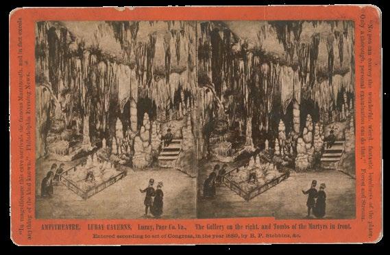 Only three Virginia “grottoes”—today we call them caverns—were well known at that date (Gap Cave, at Cumberland Gap, and in Augusta County, Madison’s Cave and Grand Caverns), but reports of others apparently reached Milbert. In the next hundred years, six more significant caverns would in fact be discovered. They were found in Page County (Luray Caverns, 1878), at New Market (Endless Caverns, 1879), Quicksburg (Shenandoah Caverns, 1884), Natural Bridge (Natural Bridge Caverns,1890s), Salem (Dixie Caverns, 1920), and Front Royal (Skyline Caverns, 1937). Of them all, the most extensive and most visually captivating would prove to be the spectacular ones at Luray, the largest and most popular caverns in eastern America.