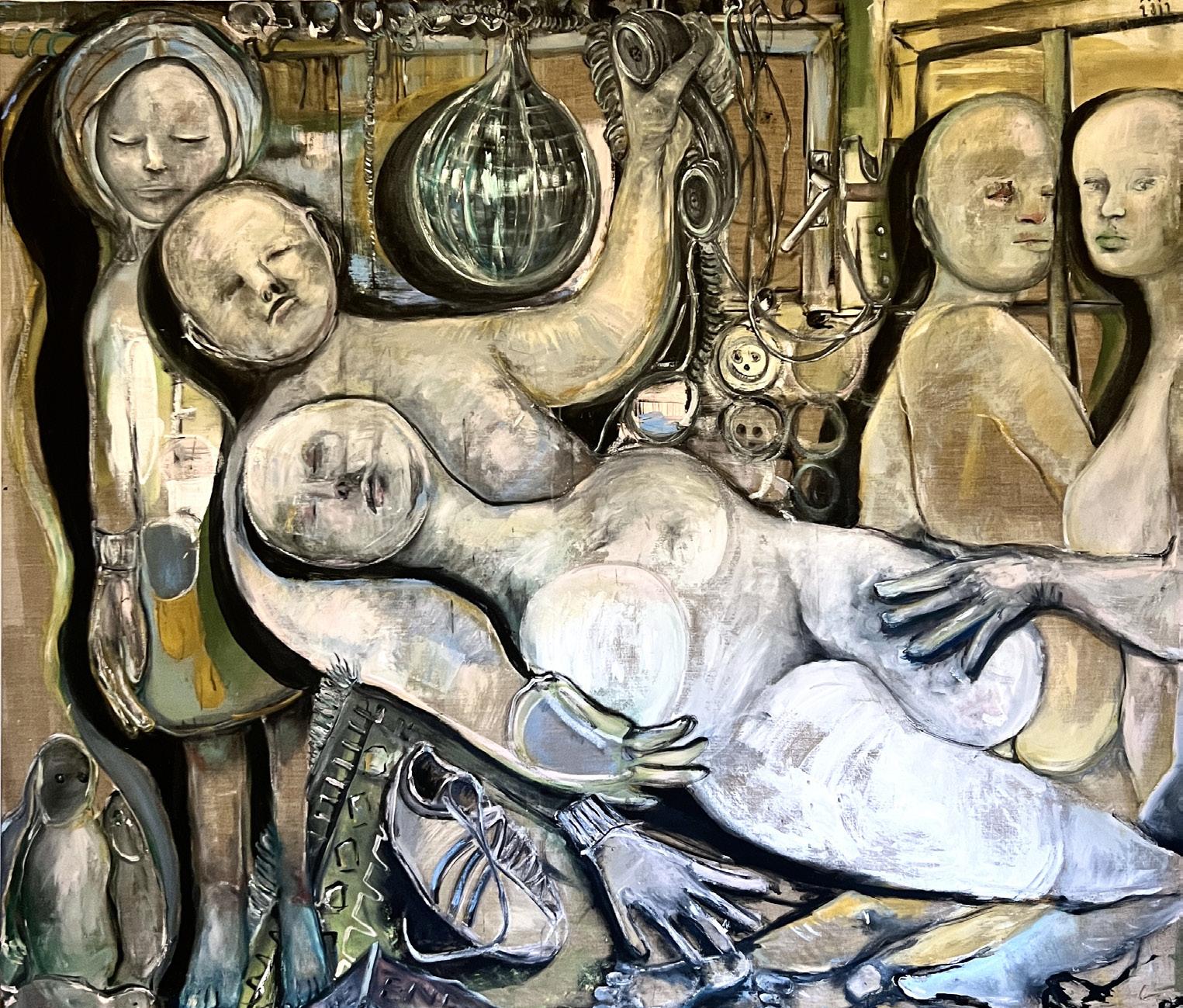 Four large-format works from the series “Ides of March” (oil on canvas, 2022) were creat ed for the exhibition “Another Chance”. They portray, from left to right, a snapshot of a world that has fallen into disarray. Men, wom en and rats symbolise the troubled times and chaos that is widespread through everyday life in TelephoneEurope.cables, rat tails and pigtails run almost like red thread from picture to pic ture, connecting the pieces and highlighting the transition from chaotic suffering to hope ful departure. Women drive this change, this “rethinking”, and are the symbol of change and renewal.