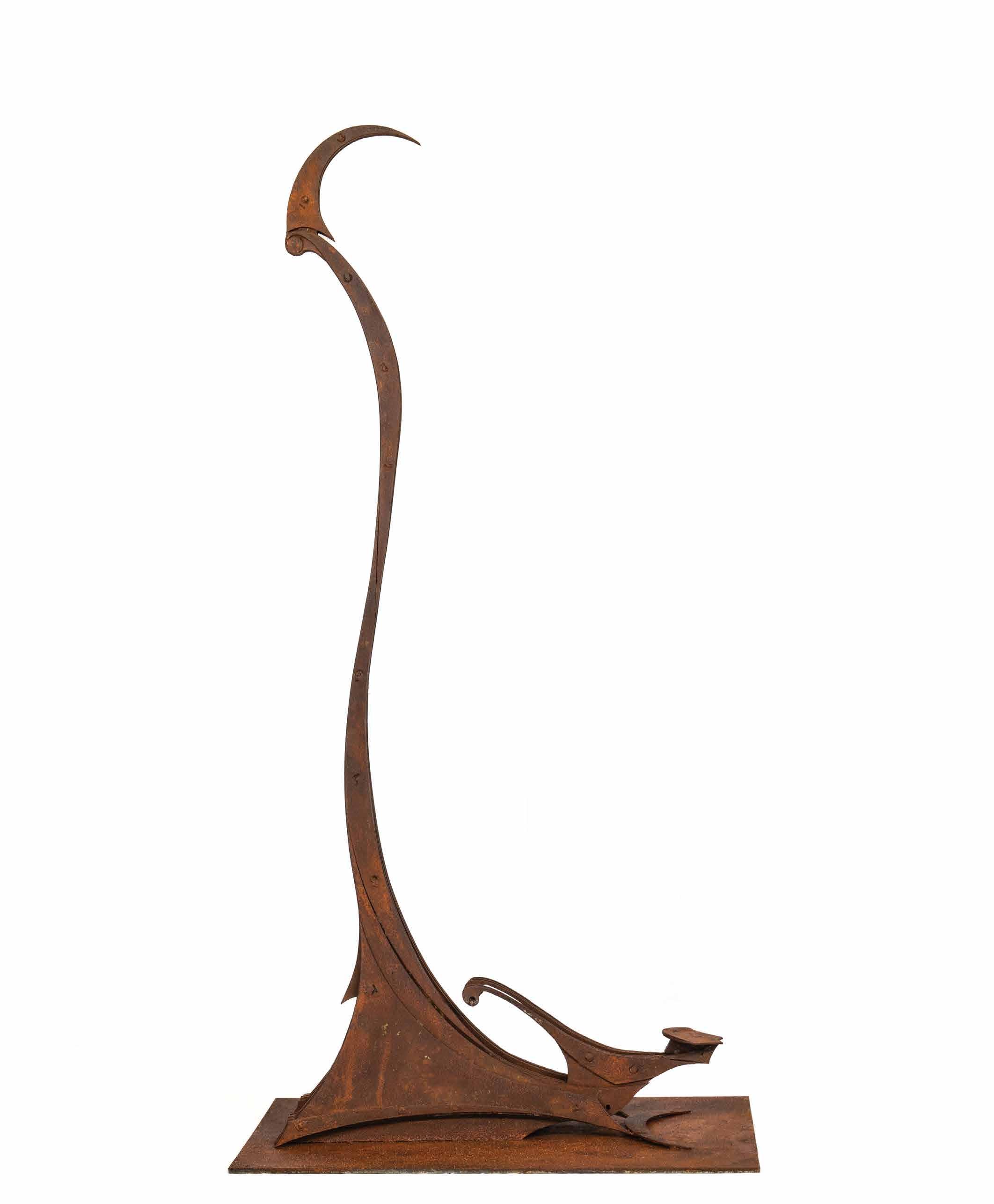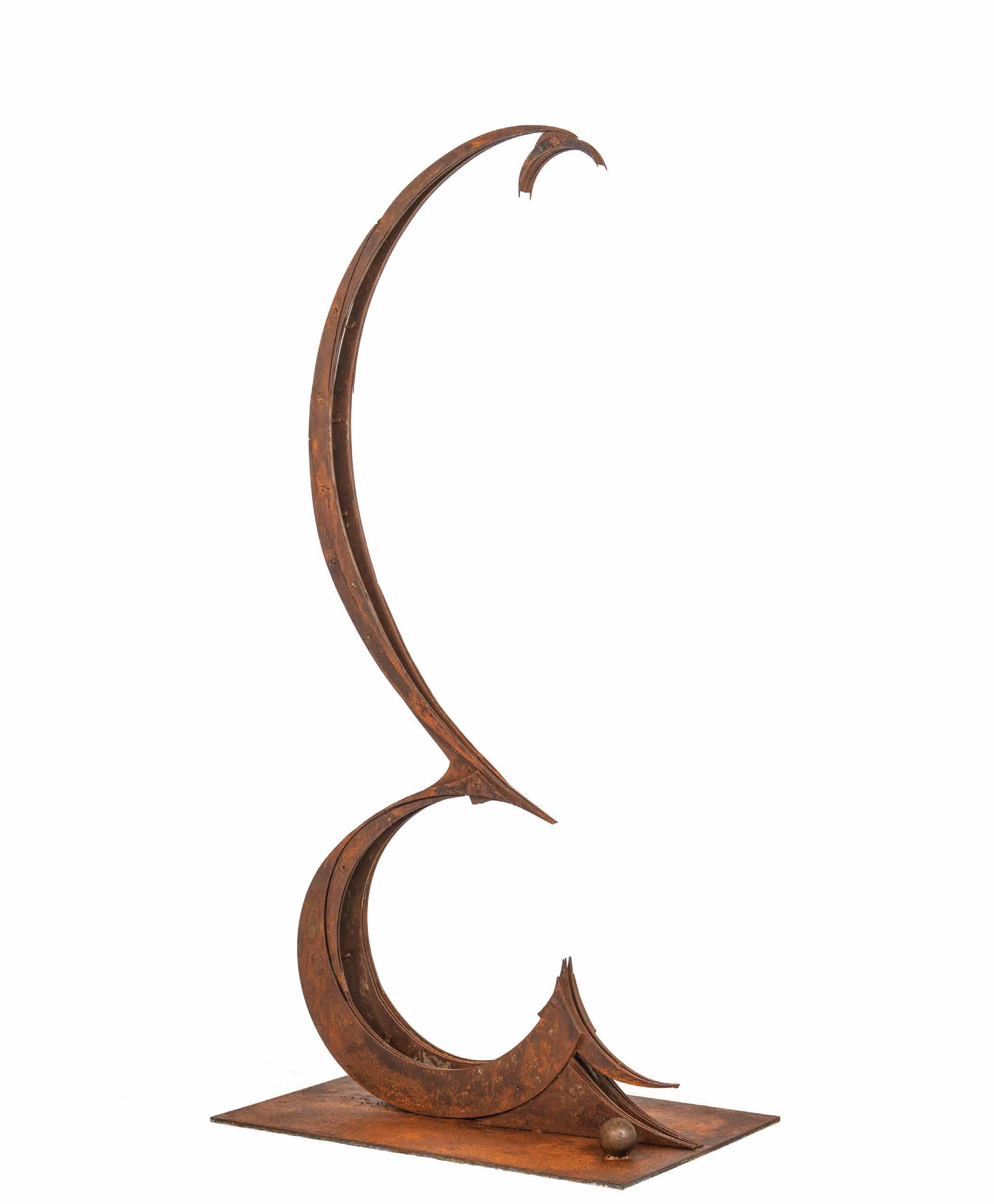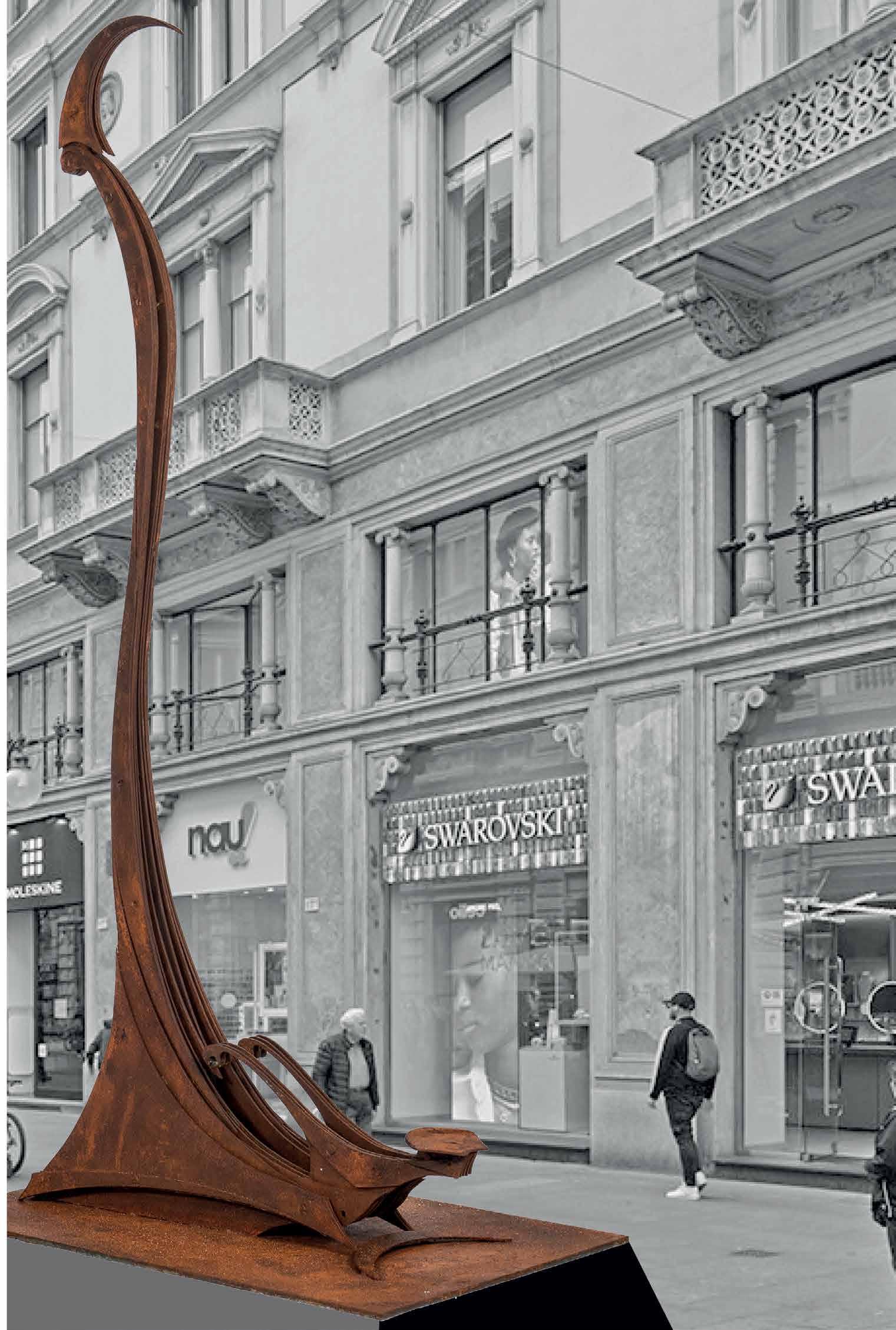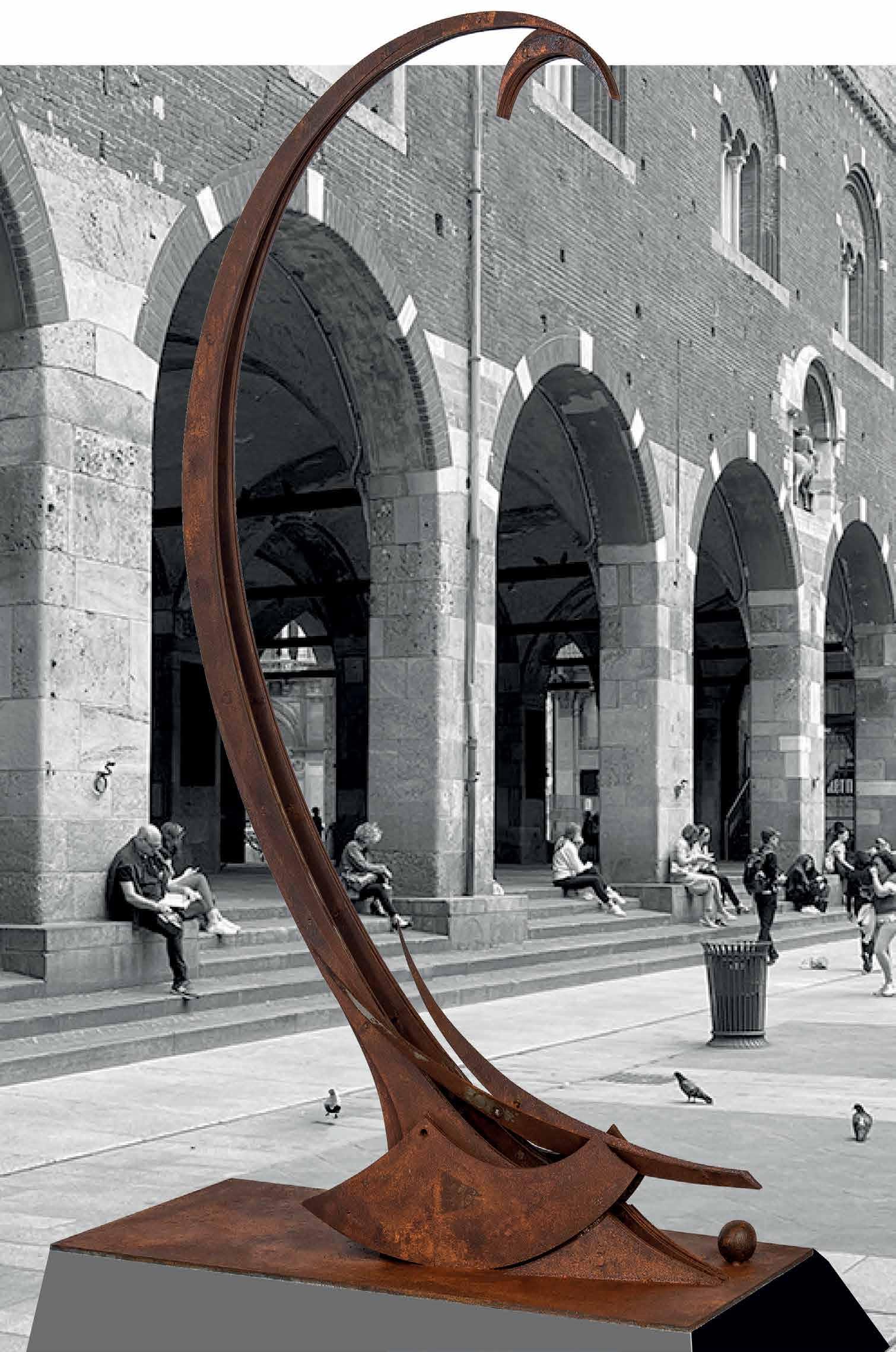 scultura in acciaio corten con led altezza m 5,5, base m 4,10 x 1,20