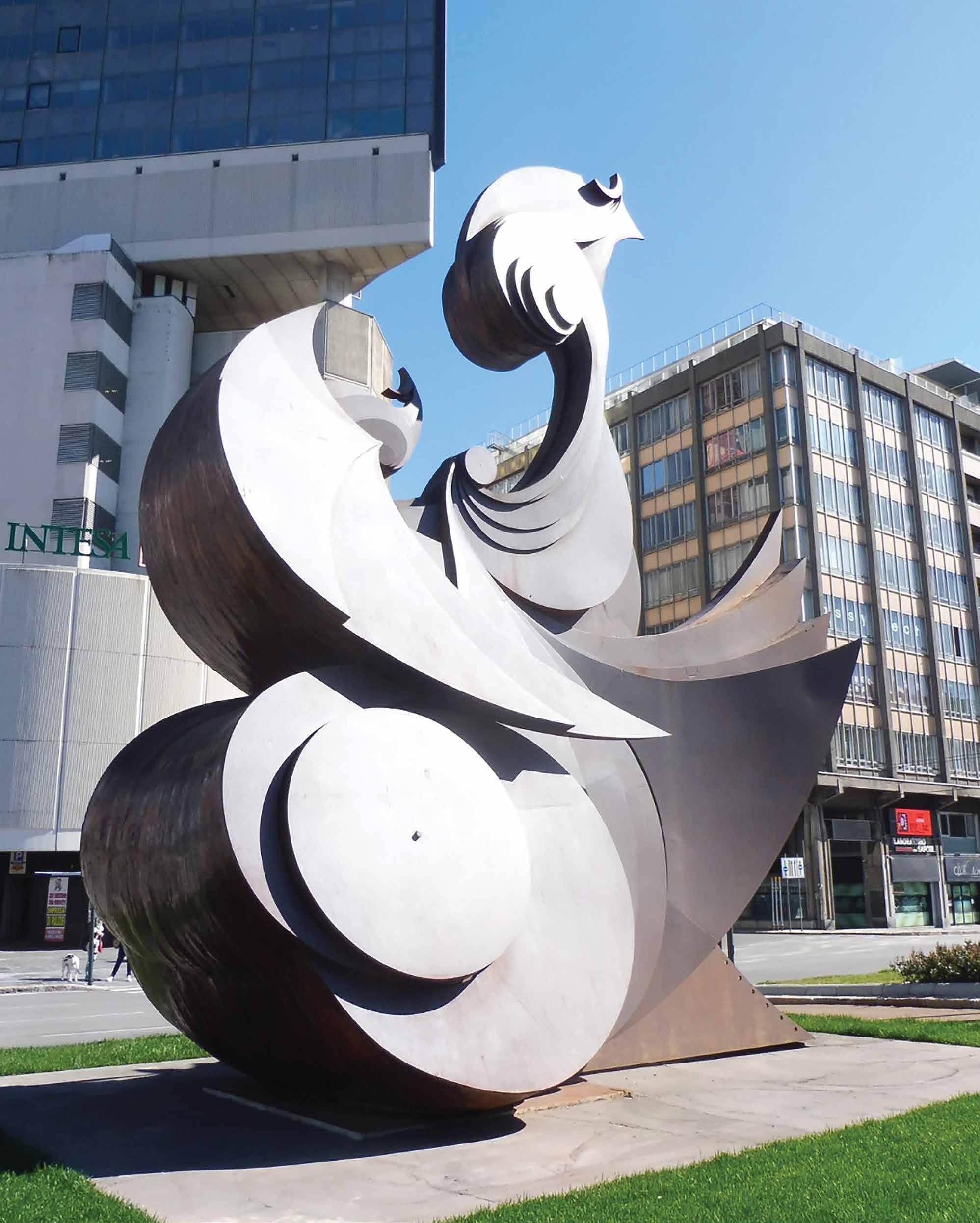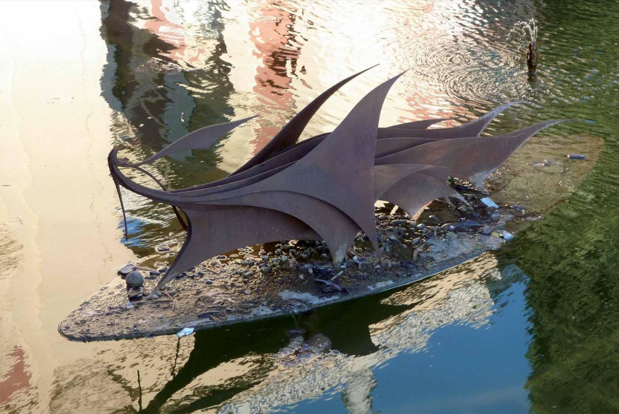 scultura in acciaio corten con led, panchina di ferro, vasca con acqua altezza m 6,8, base m 3,5 x 1,6