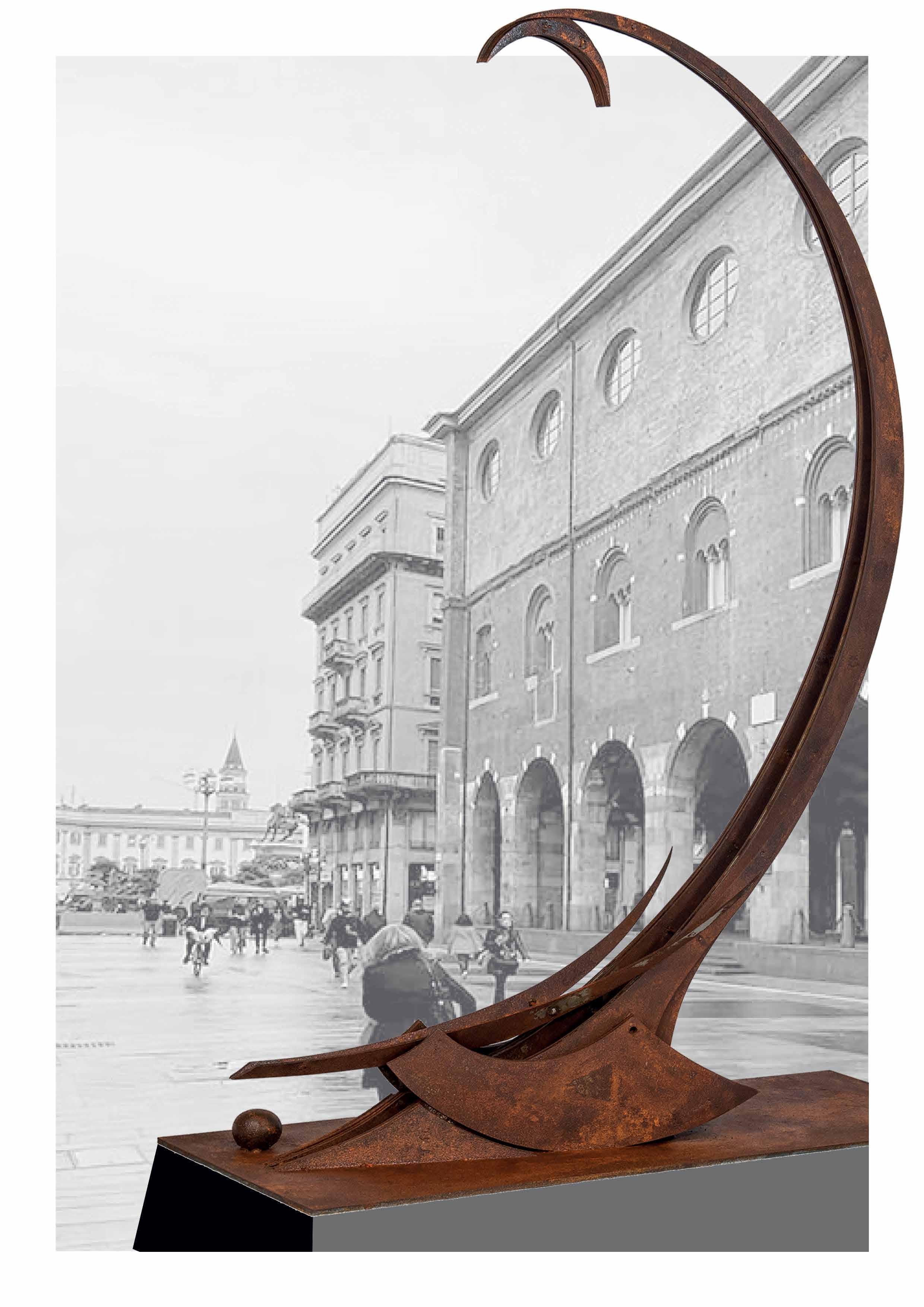 scultura in acciaio corten con led altezza m 6, base m 2 x 1,5