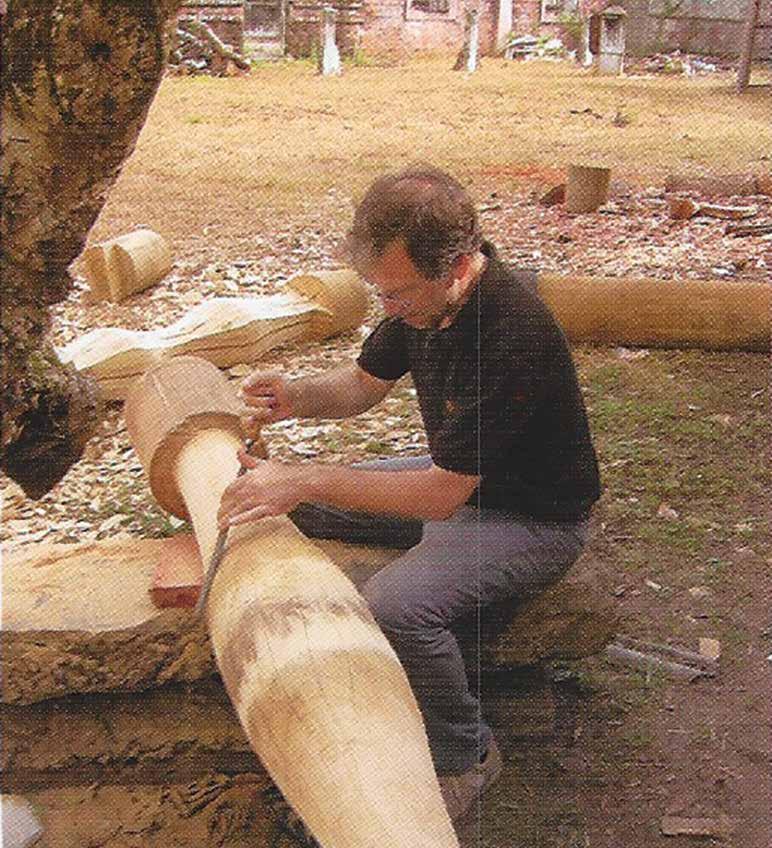 Lampione n. 5 - Ouverte H24 scultura in acciaio corten con led, ceppo da macellaio di legno, inserti di bronzo altezza m 6, base m 3 x 1,5