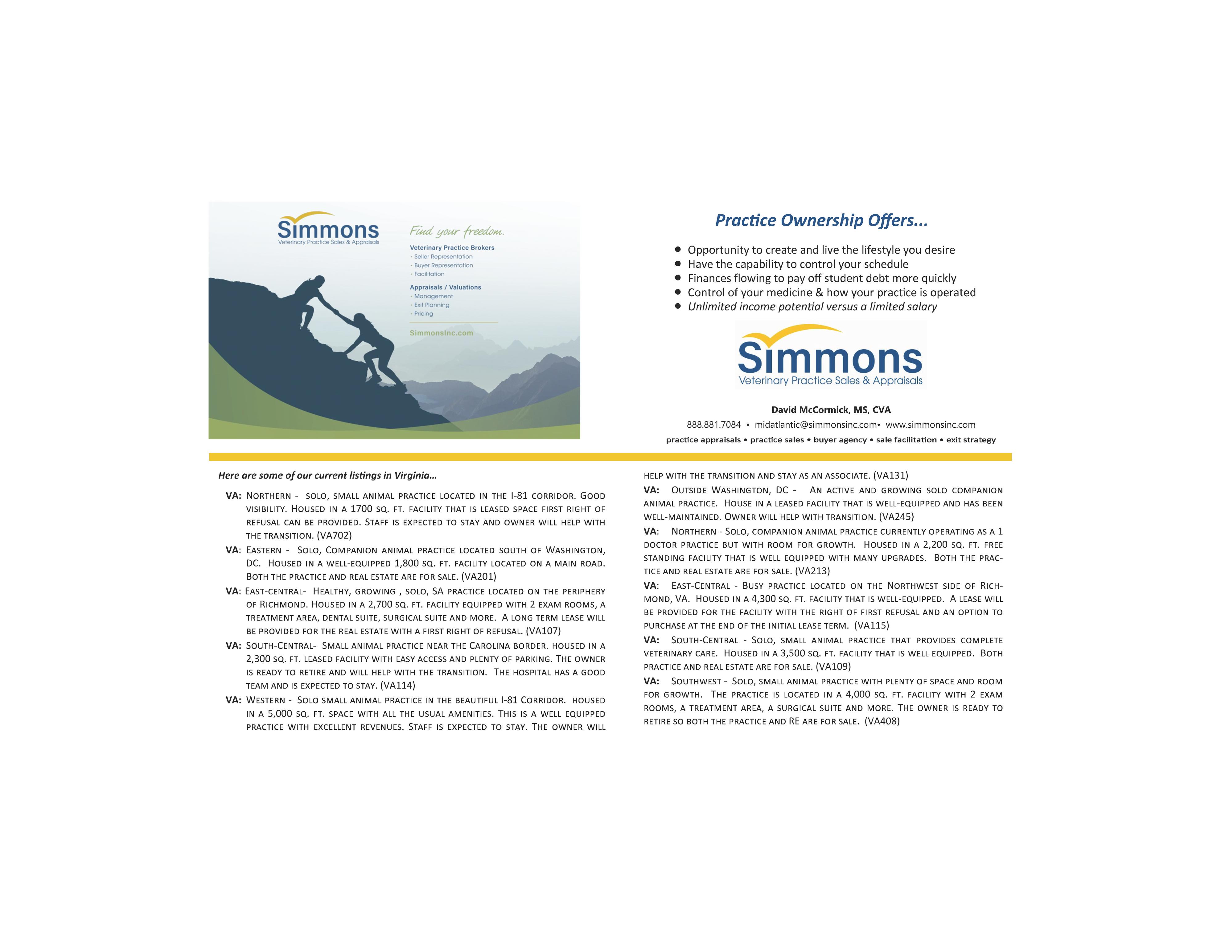 Available 7 days/week for short or long term in the Shenandoah Valley Available for both small animal or equine work Private practitioner for 25 years. NC State graduate. I hold Virginia, USDA and DEA licenses.