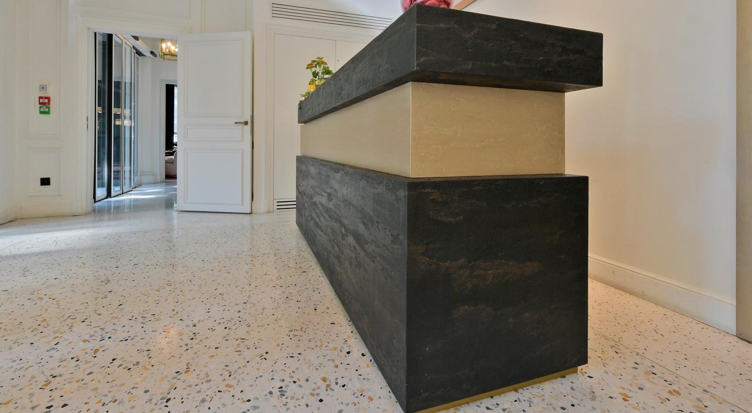 Produits à base de marbre de Carrare, appliqués en intérieur sur le chantier sur plaques de plâtre cartonnée, bétons, anciennes peintures, médiums...à la truelle.